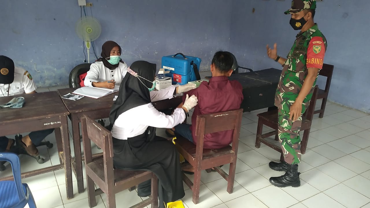 “Sebelum divaksin warga terlebih dahulu harus cek tensi dan suhu badan oleh petugas kesehatan, input data, screening kemudian baru di berikan penyuntikan vaksin itupun jika memenuhi syarat kesehatan. Setelah divaksin peserta harus menunggu kurang lebih 30 menit di ruang observasi untuk mengetahui apakah ada reaksi dari vaksin tersebut,” jelas Sertu Susilo.