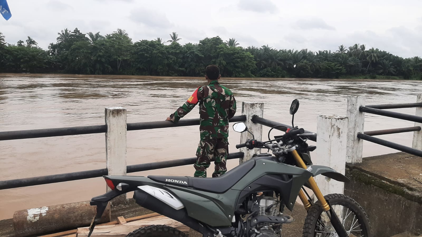Sertu Bambang Babinsa Koramil 406-04/Muara Lakitan Patroli pastikan ketinggian debit Air sungai Lakitan.