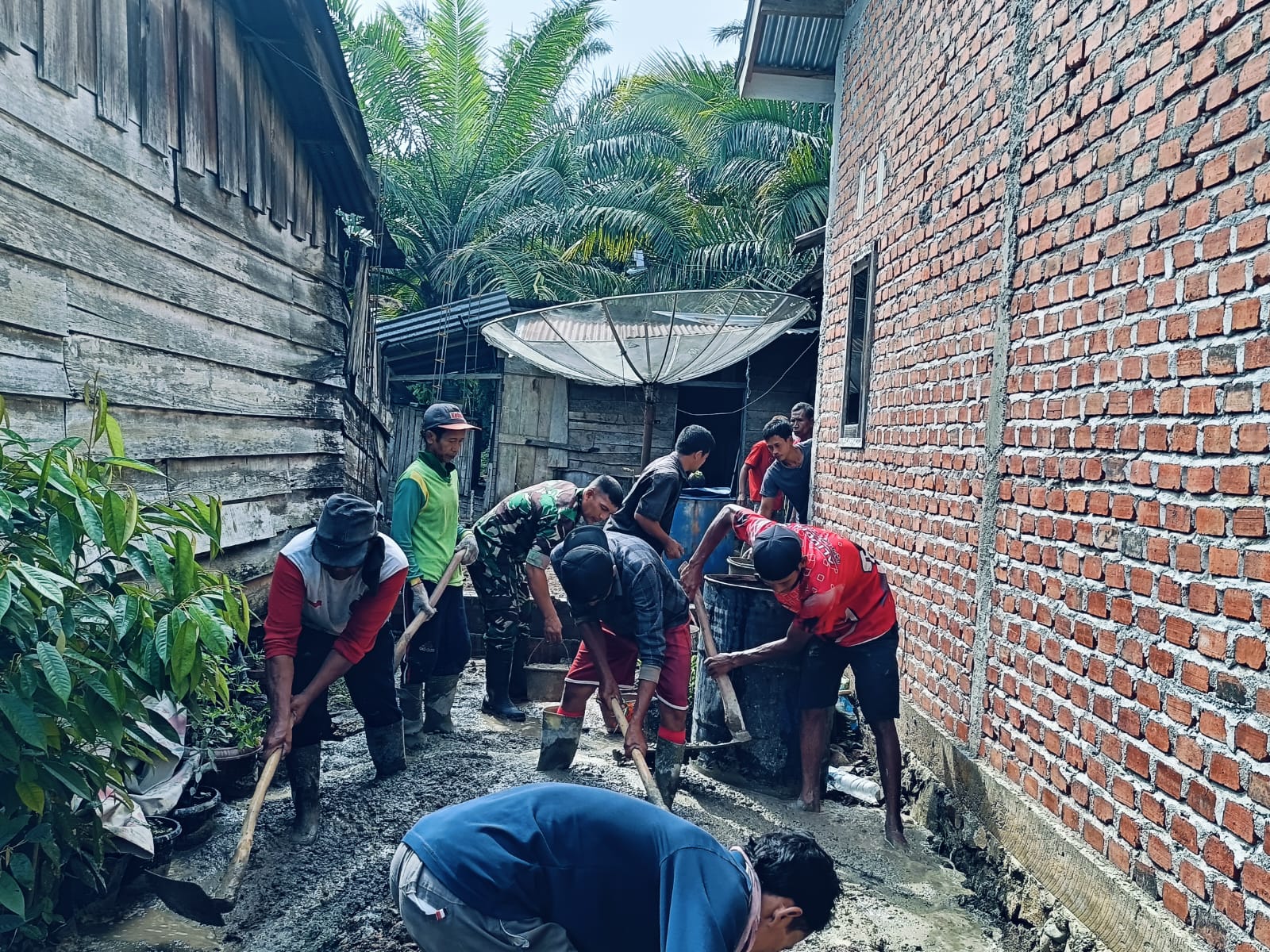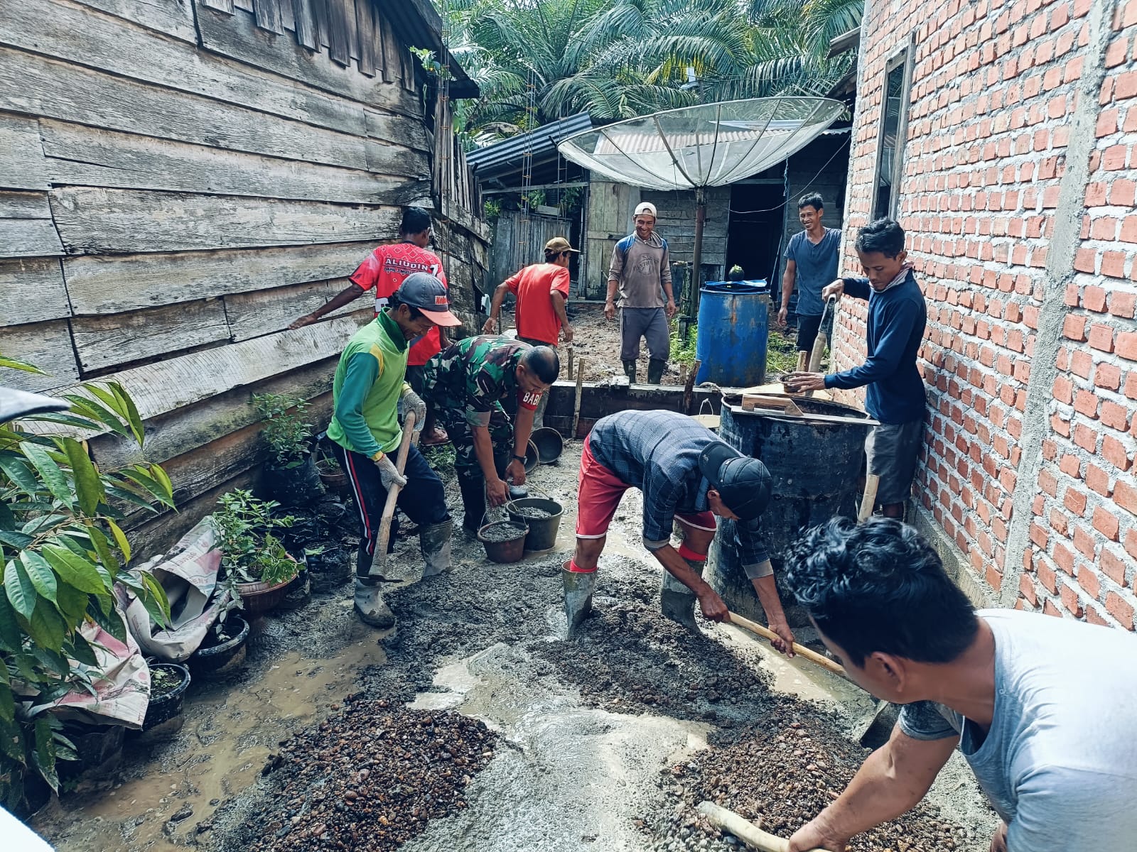 Sertu Antoni, Babinsa Koramil 04/Muara Lakitan membantu warga kelurahan Megang sakti l angkat batu dan mengaduk pasir untuk membangun dapur milik bapak kusmo.
