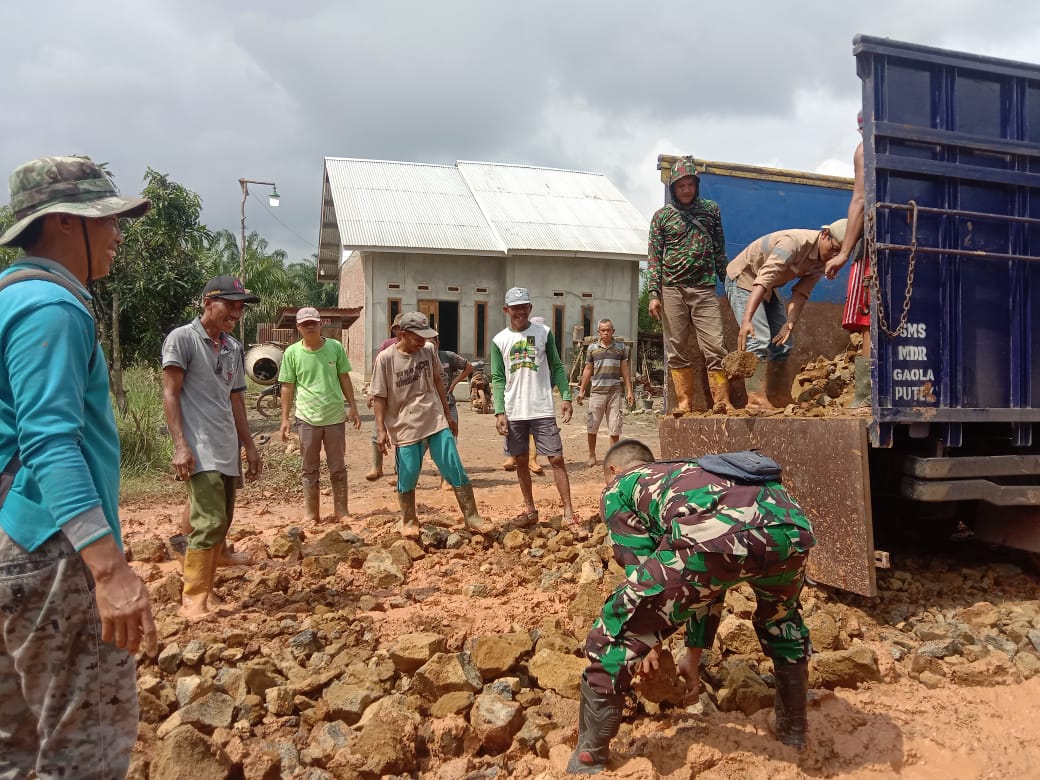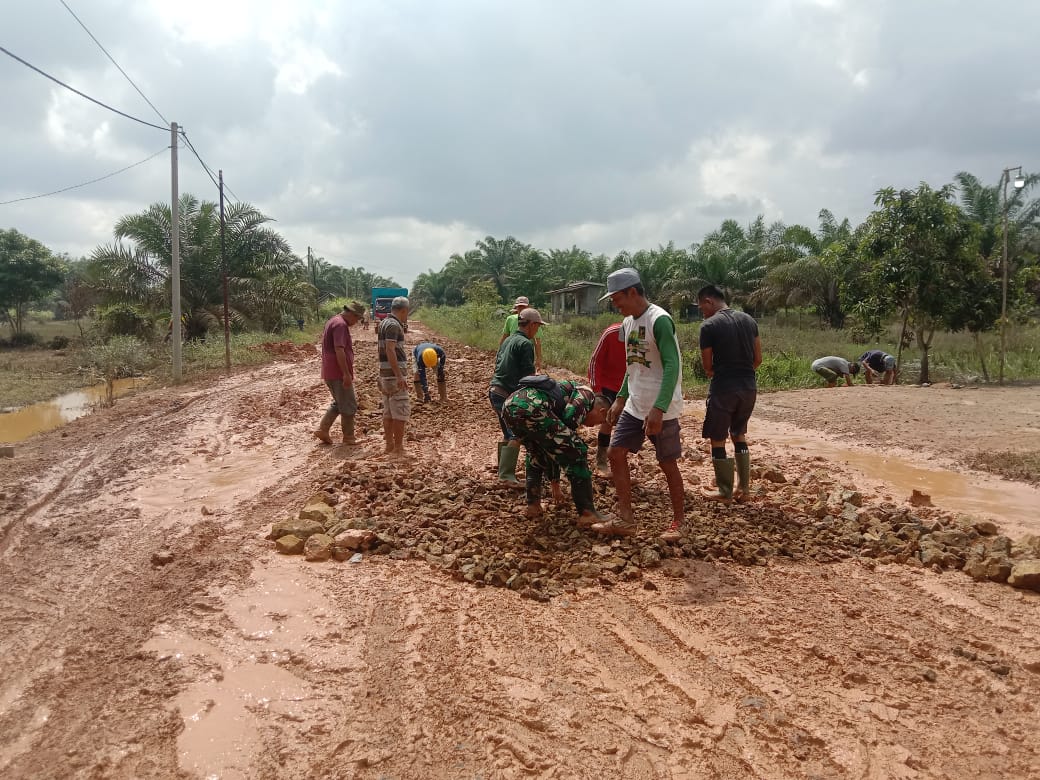 Babinsa dan Warga Desa Prabumulih 2 Gotong Royong Perbaiki Jalan yang Rusak dan berlubang