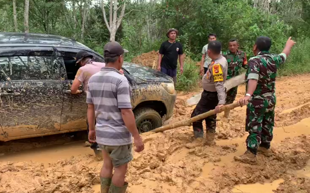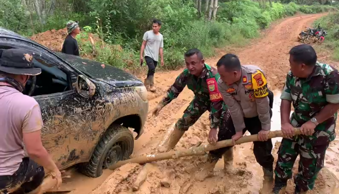 Proses susah payah dan harus bermain lumpur untuk mencapai suatu tujuan pengawalannya. Anggota Koramil jajaran Kodim 0406/Lubuk Linggau dan anggota Polres Muratara itu harus melalui medan yang sulit karena sebagian besar jalan tanah yang rusak , becek serta berlumpur.