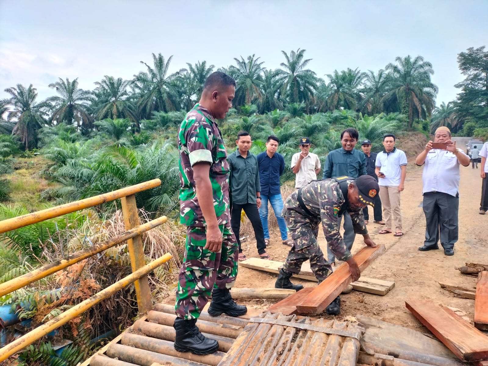 Menanggapi hal tersebut Babinsa Pelda Rohmadani berkoordinasi dengan pihak Pemerintah Desa dan pihak perusahaan untuk bersama-sama memperbaiki jembatan dengan menambahkan kayu di pangkal jembatan agar dapat dilalui kendaraan.