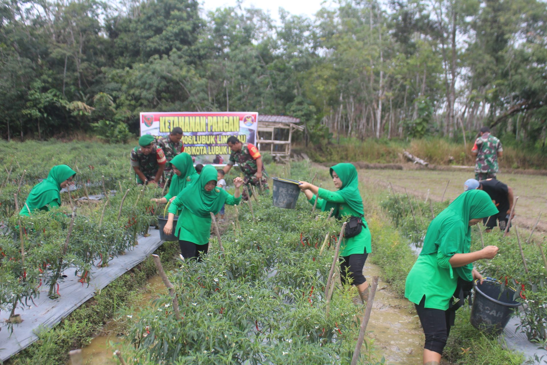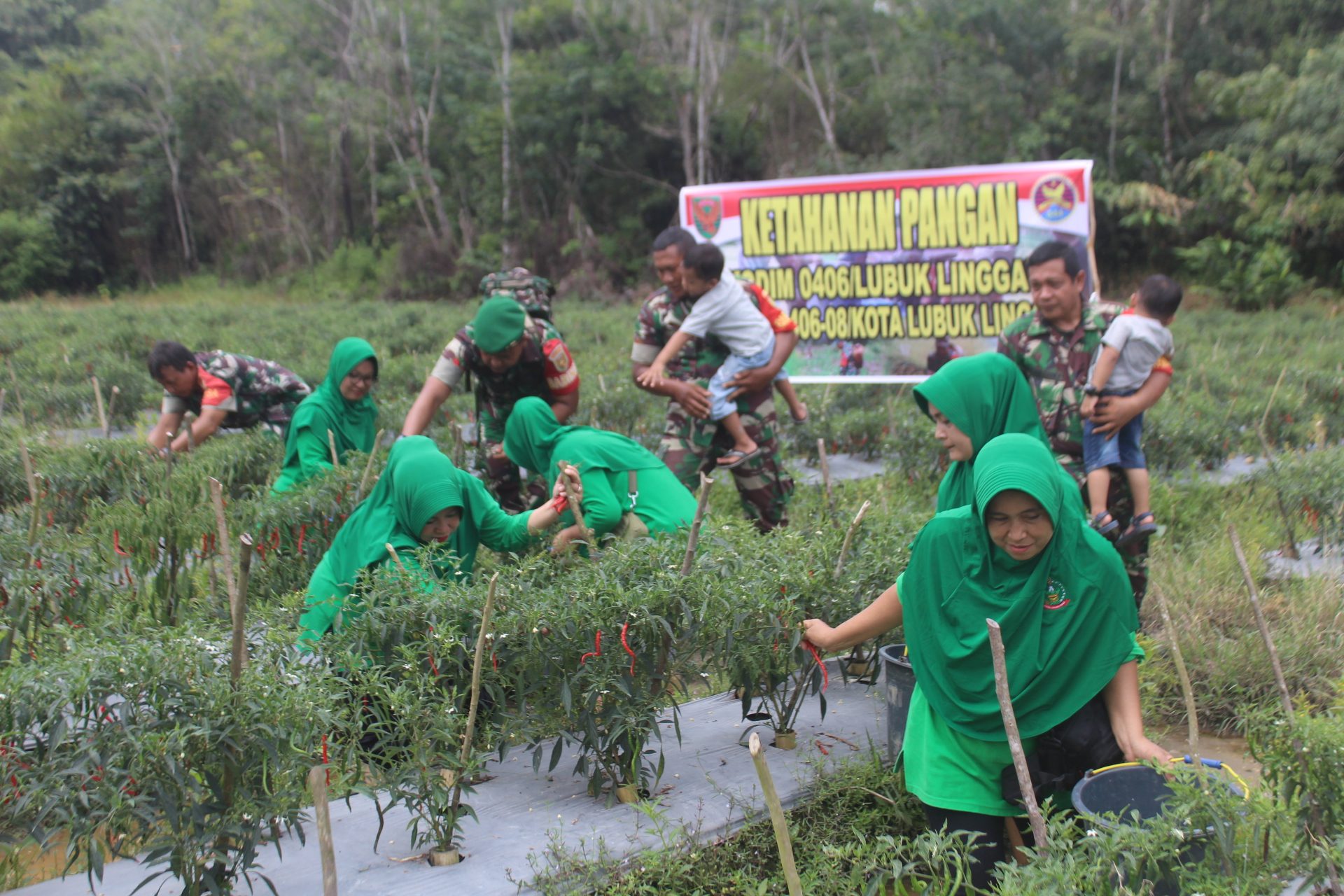 Lensa Garuda- Lubuk Linggau. Dalam rangka peningkatan ketahanan pangan, Danramil 406-08/Kota Lubuk Linggau Kapten Inf Well Edwar Roni bersama para Babinsa dan Ketua Ranting 7 Persit KCK Cabang XVII dan anggota Persit melaksanakan panen Raya cabe dan terong di lahan ketahanan pangan binaan Koramil 406-08/Kota Lubuk Linggau. Kelurahan Taba Baru RT 03 , Kota Lubuk Linggau. Kamis (07/03/2024).