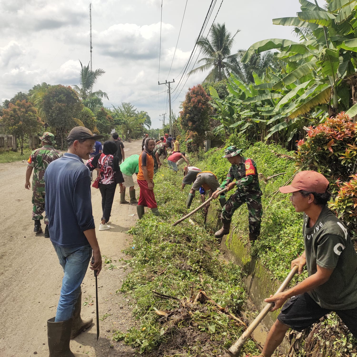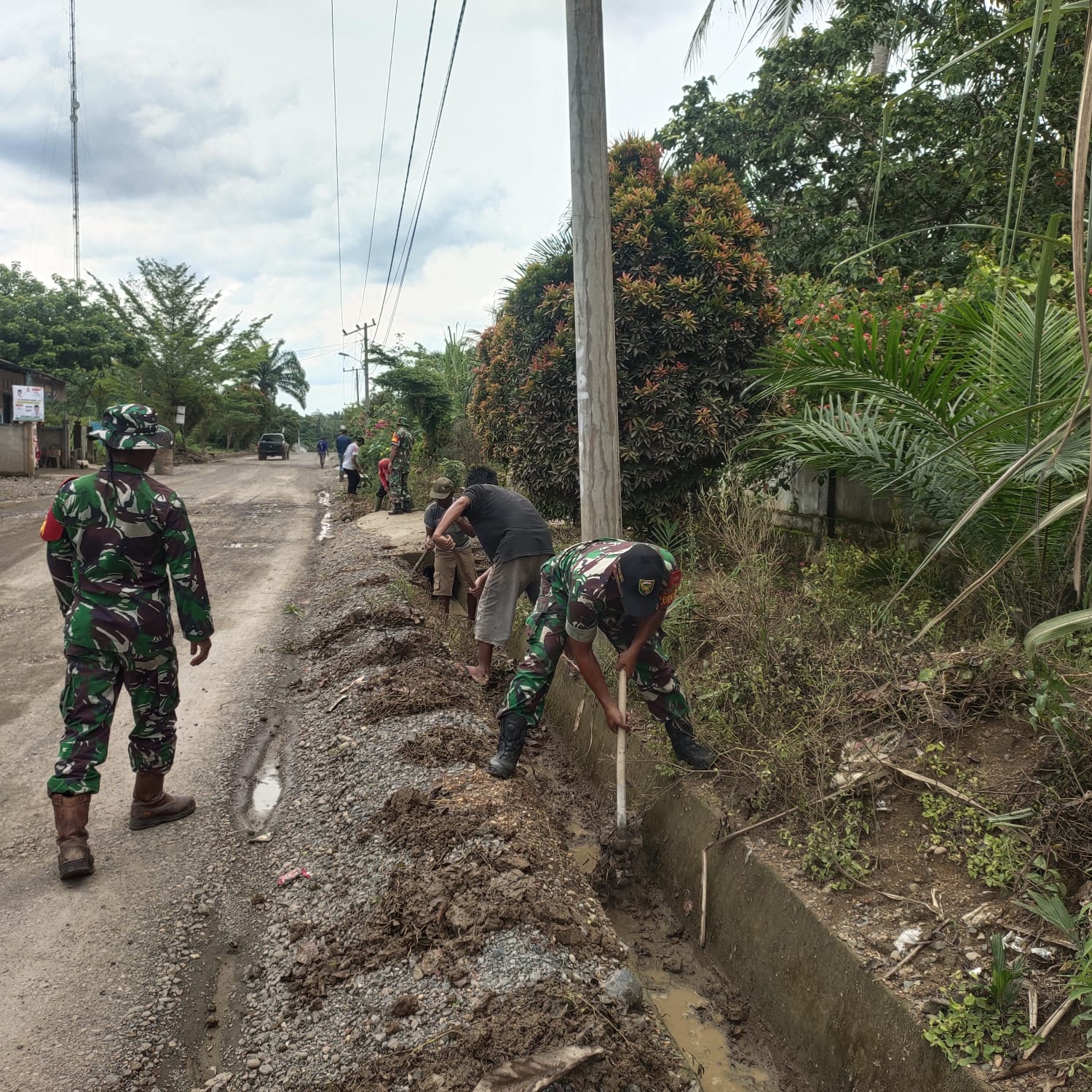 Babinsa Koramil 406-07/jayaloka Sertu Abdul Rohim Kodim 0406/Lubuklinggau dengan warga gotong royong membersihkan aliran air atau parit di Desa ciptodadi Kecamatan suka karya Kabupaten Musi Rawas. Minggu (10/03/2024)