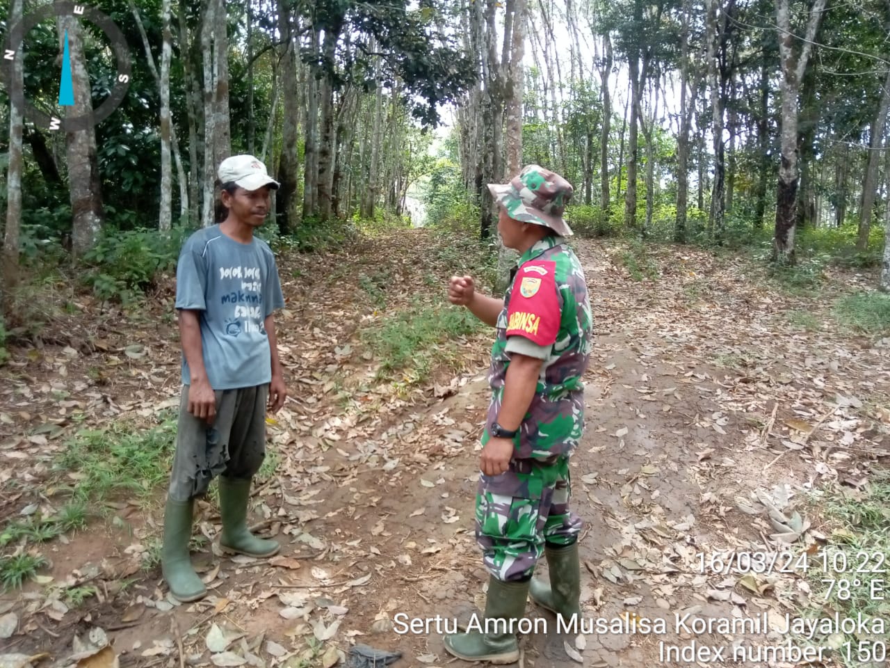 Babinsa ramil 406-07/jayaloka, Kodim 0406/Lubuklinggau Sertu Amron musalisa melaksanakan kegiatan komunikasi sosial(Komsos) bersama petani karet di area perkebunan karet milik pak joko dengan luas 2 hektar di Desa ciptodadi, Kecamatan jayaloka, Kabupaten Musi Rawas, Sabtu (16/03/2024)