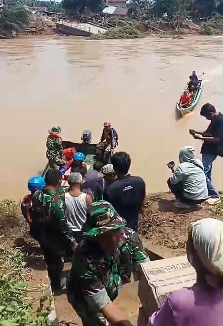 Pada kesempatan tersebut Kasdim Mayor Inf Nur Sigit Prasetya S.I.P.,M.Sc didampingi Pasi Ops Lettu Inf Ferli Ardiansyah serta Danramil Kapten Inf Assad serta Babinsa membantu masyarakat menyebrang menggunakan perahu LCR karena akses jembatan terputus.
