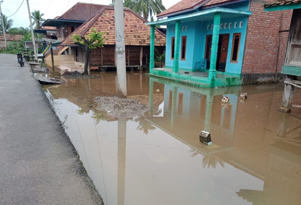> Jalan poros penghubung antara desa BM 1 dan desa tanjung raja masih tergenang air mencapai ± 15 Cm.