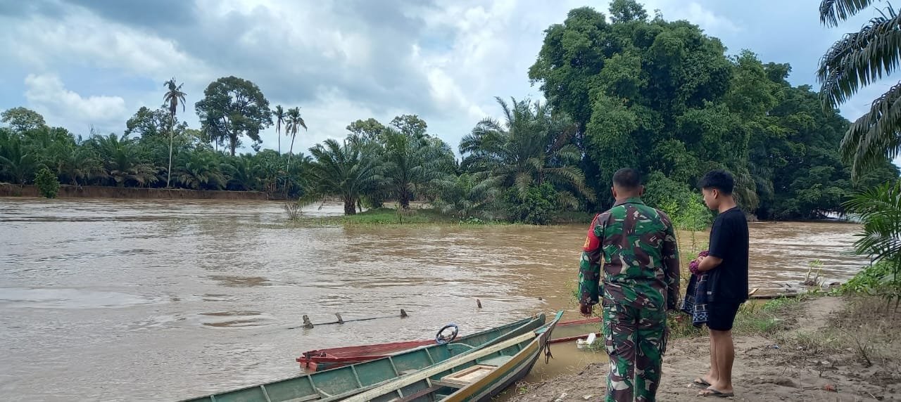 Dengan melaksanakan patroli sekitar tepian sungai dan tempat rawan banjir, Babinsa mengecek debit air di desa binaan Kecamatan Rupit.