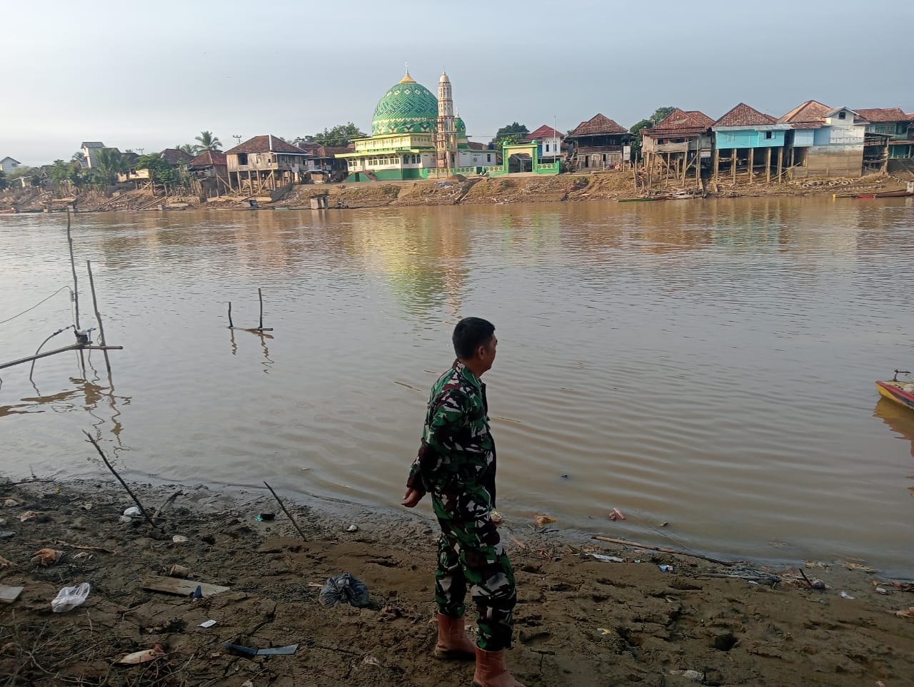 Dengan melaksanakan patroli sekitar tepian sungai dan tempat rawan banjir, Babinsa mengecek debit air di desa binaan Kecamatan Rawas ilir.