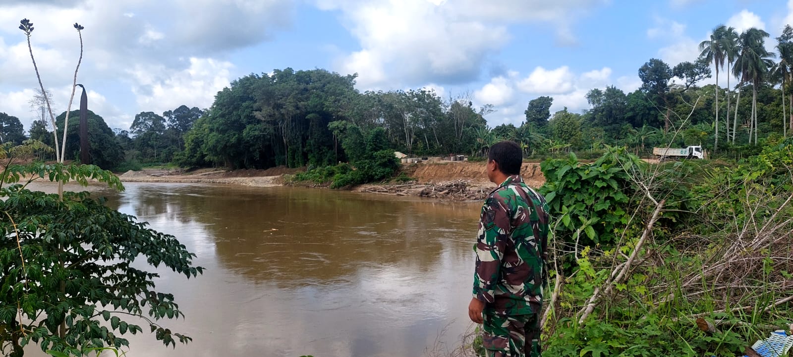 Dengan melaksanakan patroli sekitar tepian sungai dan tempat rawan banjir, Babinsa mengecek debit air di desa binaan Kecamatan rawas ulu.