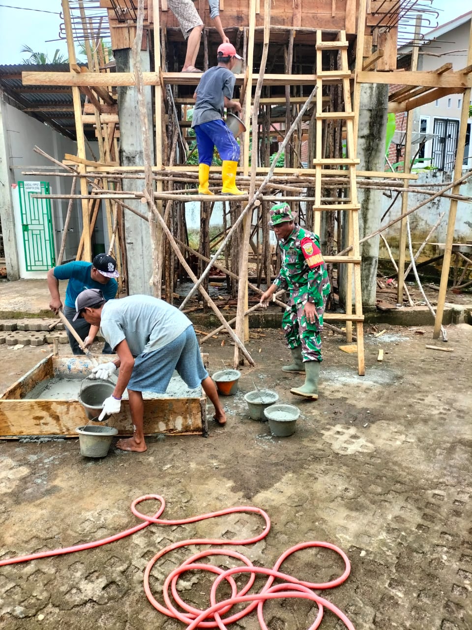 Dengan bermodalkan alat seadanya warga di bantu Babinsa Koramil 406-05/Muara Kelingi itu bahu membahu bergotong royong membangun menara masjid Al Amin,kebersamaan nampak di lakukan warga dan Babinsa,meski bergotong royong di bawah terik matahari,tidak nampak rasa lelah dari wajah mereka.