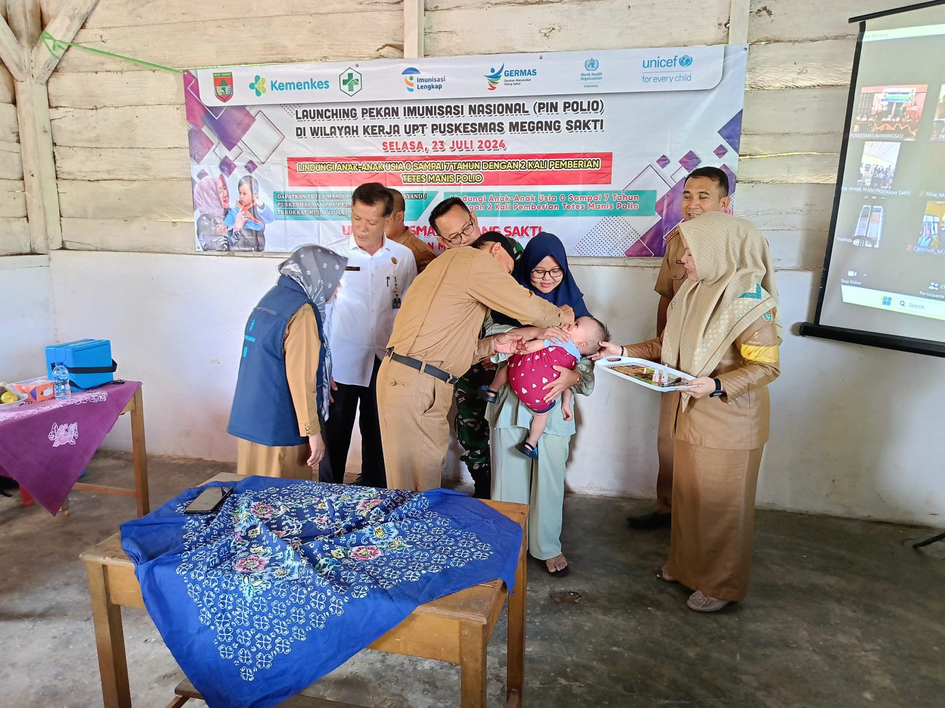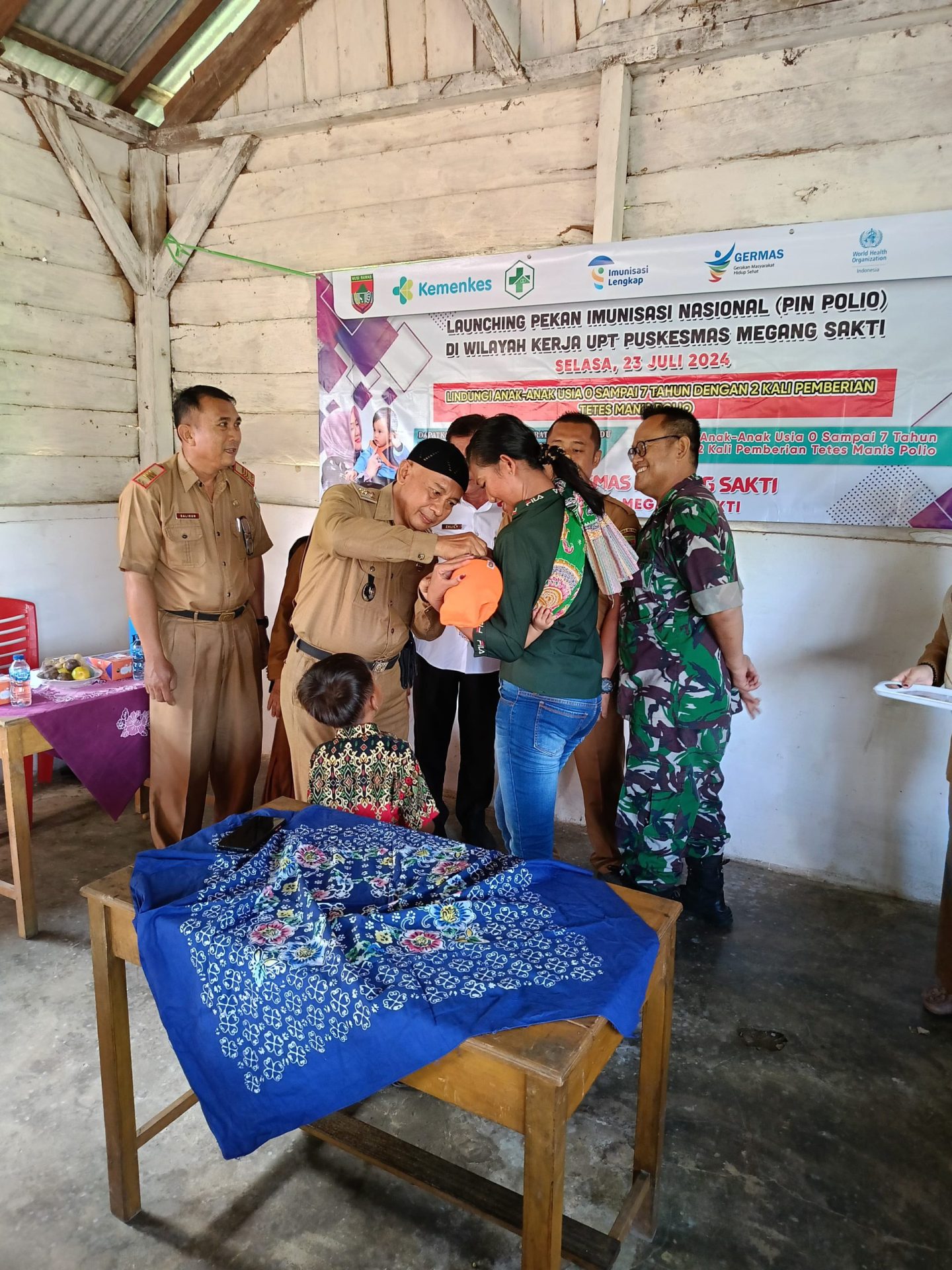 Sukseskan Program Pemerintah Bebas Polio, Babinsa koramil 406-04/Muara Lakitan Dampingi Petugas Nakes dalam rangka mendukung dan menyukseskan program Pemerintah yakni pencanangan Pekan Imunisasi Nasional (PIN) Polio secara serentak dan tersebar, Babinsa Koramil 406-04/Muara Lakitan, Kodim 0406/Lubuklinggau, pelda Rudi Yanto melaksanakan pendampingan ke petugas atau tenaga kesehatan dari Puskesmas pada saat melaksanakan tugas pemberian tetes polio kepada anak umur 0 sampai 7 tahun 11 bulan bertempat di kelurahan talang ubin, Kecamatan Megang sakti, kabupaten Musi Rawas. Selasa (23/07/2024).