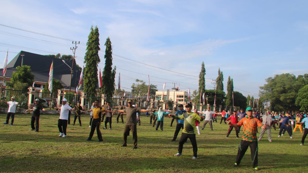 Lensa Garuda- Lubuk Linggau, Personil Kodim 0406 Lubuk Linggau di bawah pimpinan Pasi Ops Kodim 0406/Lubuk Linggau Lettu Inf Ferli Ardiansyah mengikuti senam bersama dan perlombaan di lapangan Kantor Pemerintah Kota(Pemkot) Lubuk Linggau. Jl. Garuda No 10, Kelurahan Kayu Ara, Kecamatan Lubuklinggau Barat I, Kota Lubuk Linggau. Jum’at (09/08/2024).