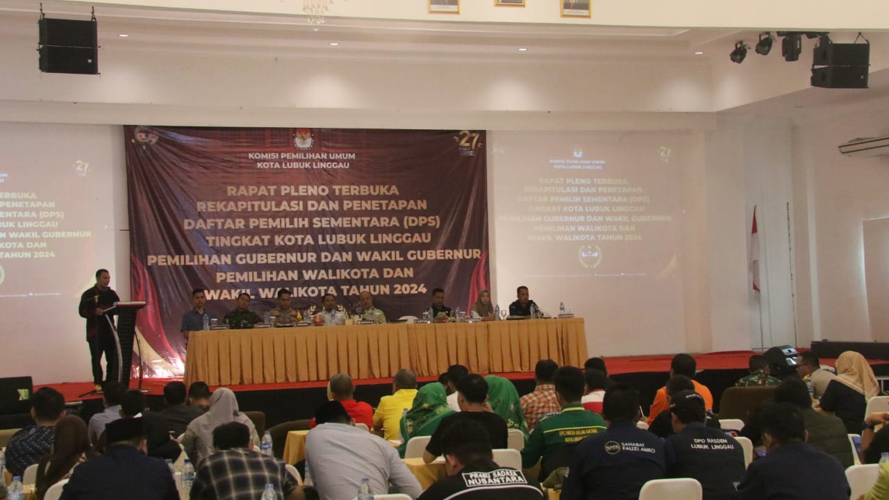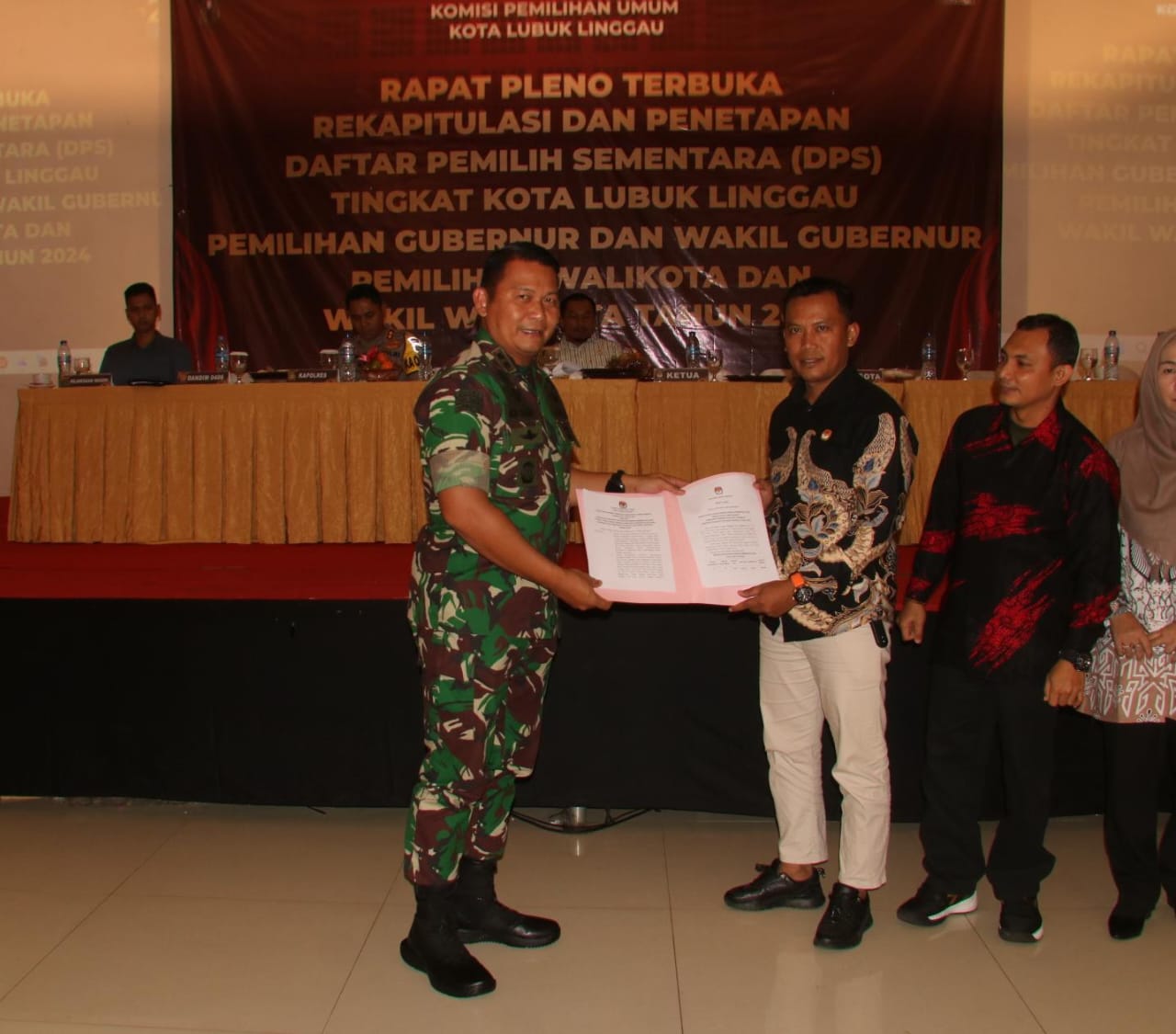 Lensa Garuda- Lubuk Linggau. Komandan Kodim 0406 Lubuk Linggau Letkol Inf Arie Prasatyo Widyo Broto S.E didampingi oleh Pasi Ops Kodim Lettu Inf Ferli Ardiansyah mengikuti Rapat Pleno Terbuka Rekapitulasi dan Penetapan Daftar Pemilih Sementara (DPS) Tingkat Kota Lubuk Linggau Pemilihan Gubernur dan Wakil Gubernur Pemilihan Walikota dan Wakil Walikota Tahun 2024. Sabtu (10/08/2024).