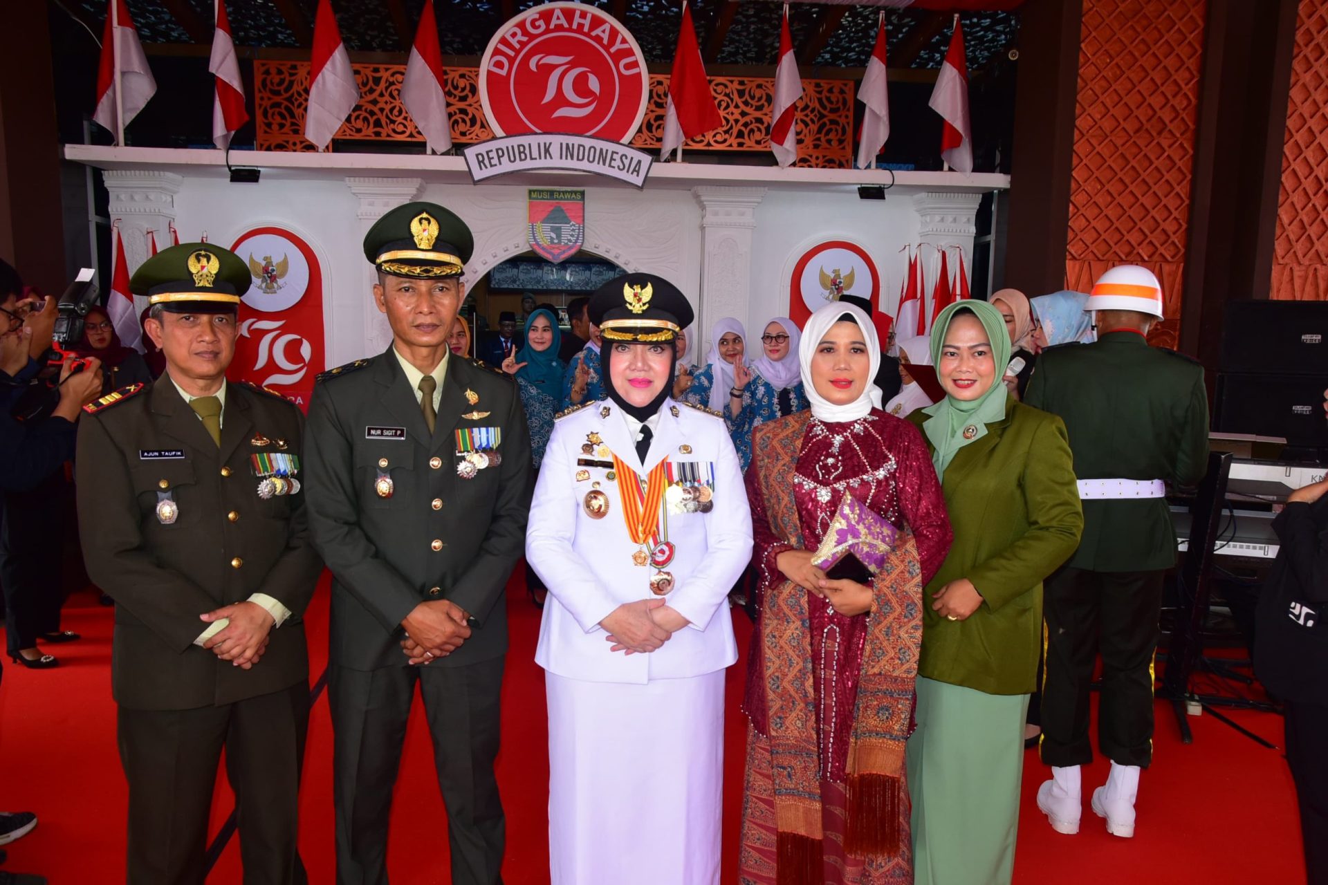 Pada upacara penaikan bendera tersebut Bupati Kabupaten Musi Rawas Hj Ratna Machmud bertindak sebagai Inspektur Upacara, dengan Komandan Upacara Danramil 406-07/Jayaloka Lettu Inf Hendri Calaus.