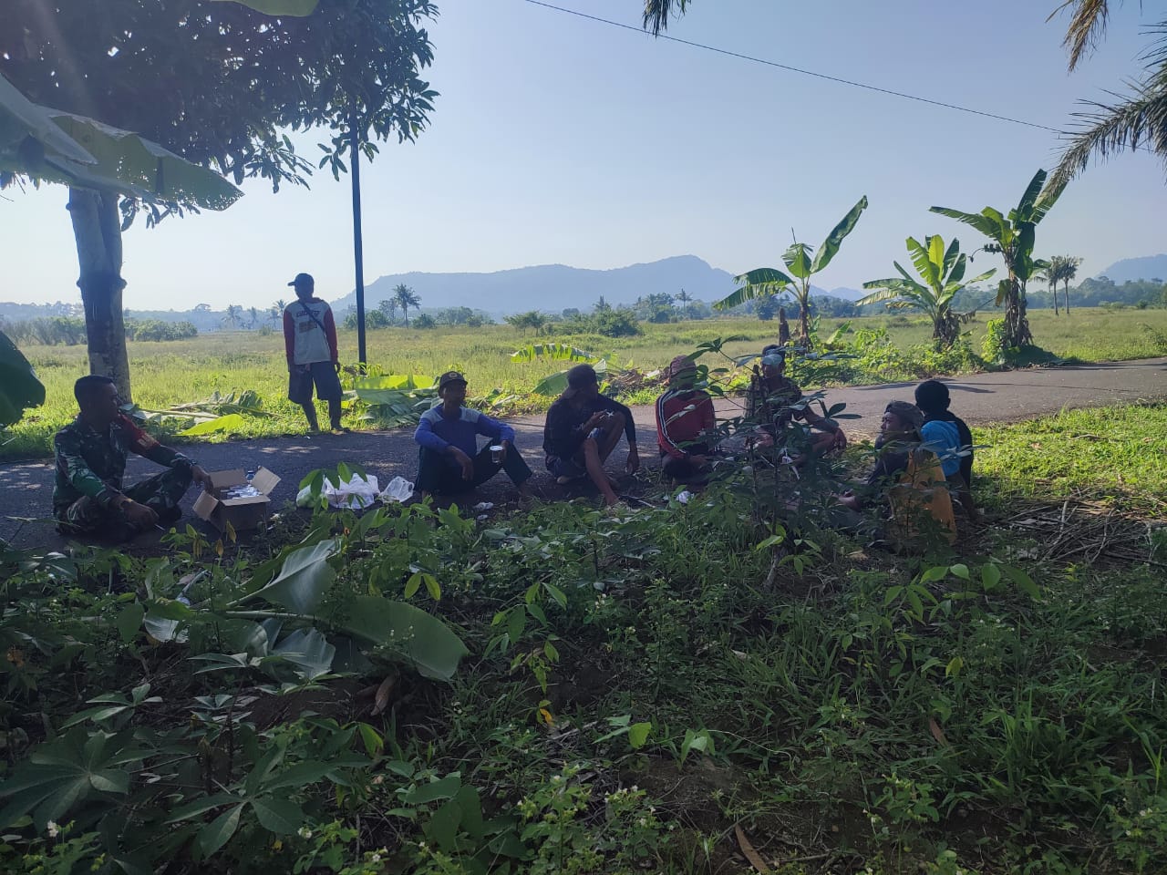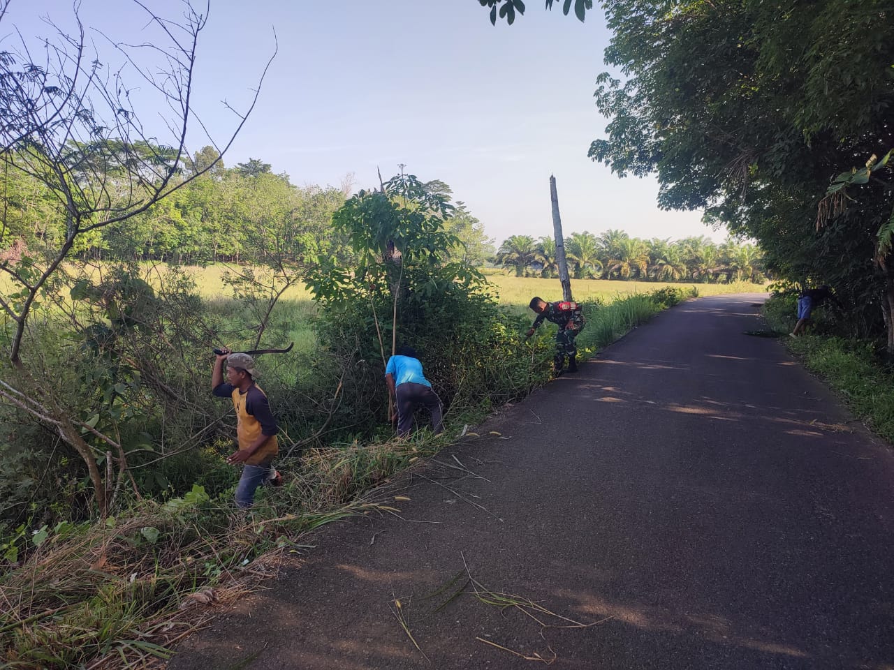 Babinsa Koramil 406-09/Terawas, Sertu Adi Susanto, melaksanakan kegiatan gotong royong bersama masyarakat dan perangkat desa dalam rangka pembersihan jalan di Desa Sumber Karya, Kecamatan STL Ulu Terawas, Kabupaten Musirawas.