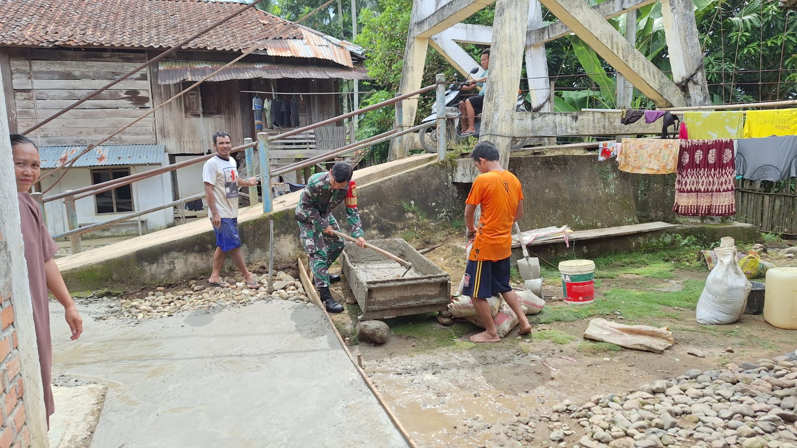Serda Febri Yanto, Babinsa Koramil 406-03/Rupit, Bersama Warga Desa Embacang Lama Gotong Royong Pengecoran Jalan
