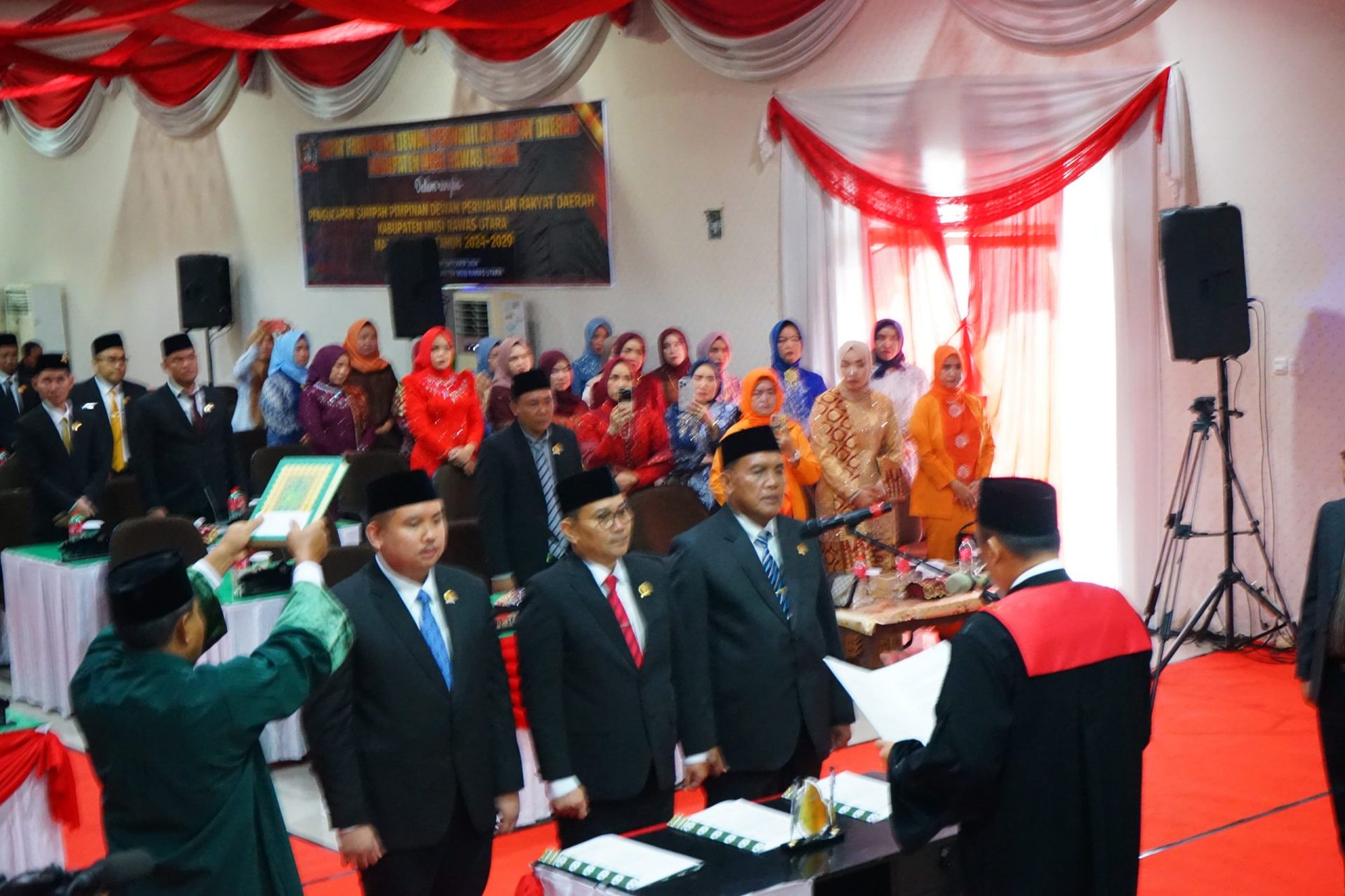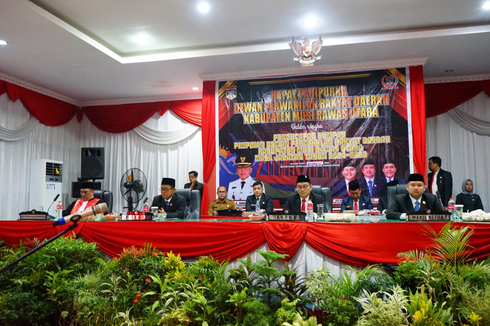 Acara Rapat Paripurna DPRD Kabupaten Musi Rawas Utara dipimpin oleh Ketua DPRD Devi Arianto S.H. Berdasarkan pasal 165 ayat 2 undang-undang Nomor 23 Tahun 2014 tentang pemerintahan daerah menyatakan bahwa pimpinan DPRD kabupaten kota sebelum memasuki jabatan mengucapkan sumpah atau janji yang dipandu oleh Ketua Pengadilan Negeri.
