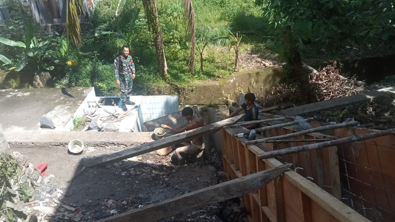 Babinsa Koramil 406-08/Lubuk Linggau melaksanakan kegiatan Komunikasi Sosial (Komsos) dan pemantauan pembangunan talud di Kelurahan Keputraan, Kecamatan Lubuklinggau Barat II, Kota Lubuklinggau, pada hari Jumat (25/10/2024).