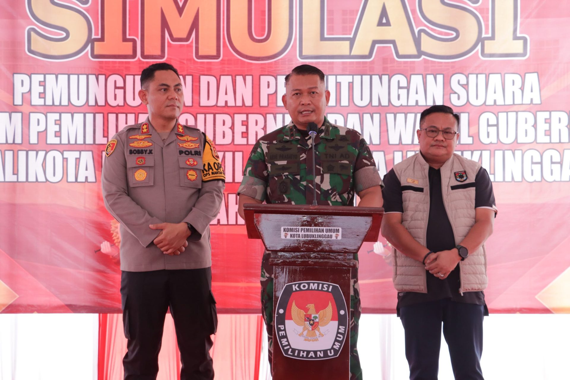 Demikian pula dengan Dandim 0406/Lubuk Linggau Letkol Inf Arie Prasatyo Widyo Broto dalam sambutannya beliau menyampaikan ,Demokrasi harus dijaga dengan baik supaya kedepannya bangsa kita ini lebih bagus makanya kita dikasih petugas-petugas KPU semuanya di sini tugasnya sangat berat. Baik TNI Polri maupun petugas yang di KPU nanti TPS selama 24 kerjanya kepada rakyat Lubuk Linggau.
