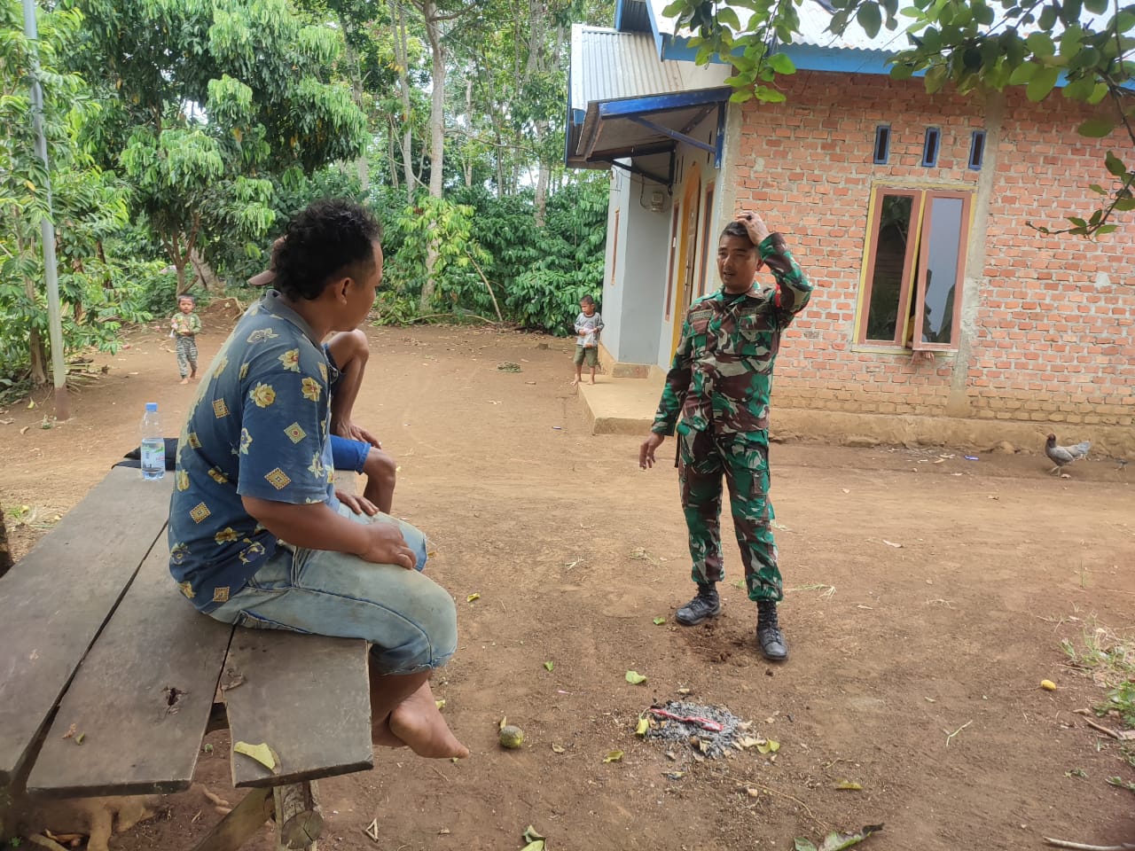 Sertu Adi Susanto, Bintara Pembina Desa (Babinsa) dari Koramil 406-09/Terawas, melaksanakan kegiatan komunikasi sosial (Komsos) bersama warga Desa Sumber Karya, Kabupaten Musi Rawas.