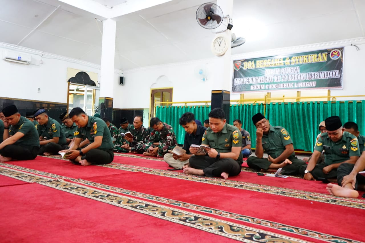 Dalam rangka memperingati Hari Ulang Tahun (HUT) ke-79 Kodam II Sriwijaya, Kodim 0406 Lubuklinggau menggelar acara doa bersama dan syukuran yang berlangsung di Masjid Al-Ikhlas Kodim 0406 Lubuklinggau, Jalan Garuda, Kelurahan Tanjung Indah, Kecamatan Lubuklinggau Barat I, Kota Lubuklinggau.