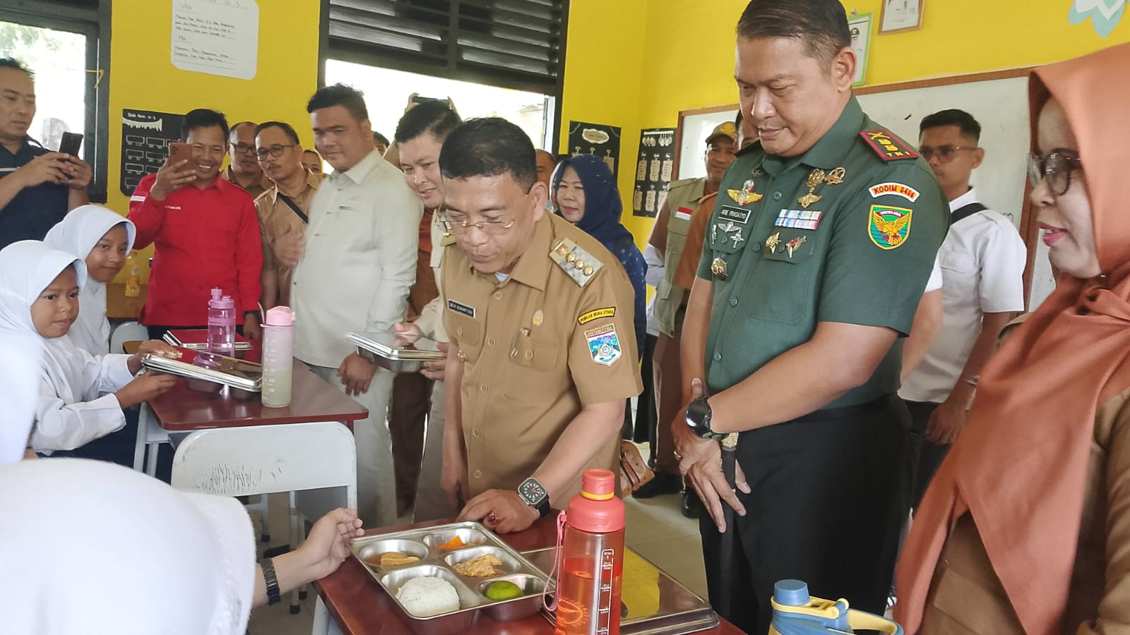 Pada kesempatan itu Dandim 0406/Lubuk Linggau Letkol Inf Arie Prasatyo Widyo Broto S.E.,M.M dan Bupati Musi Rawas Utara H Devi Suhartoni langsung memberikan makanan kepada siswa secara simbolis dan meninjau langsung menu makanan yang disajikan.