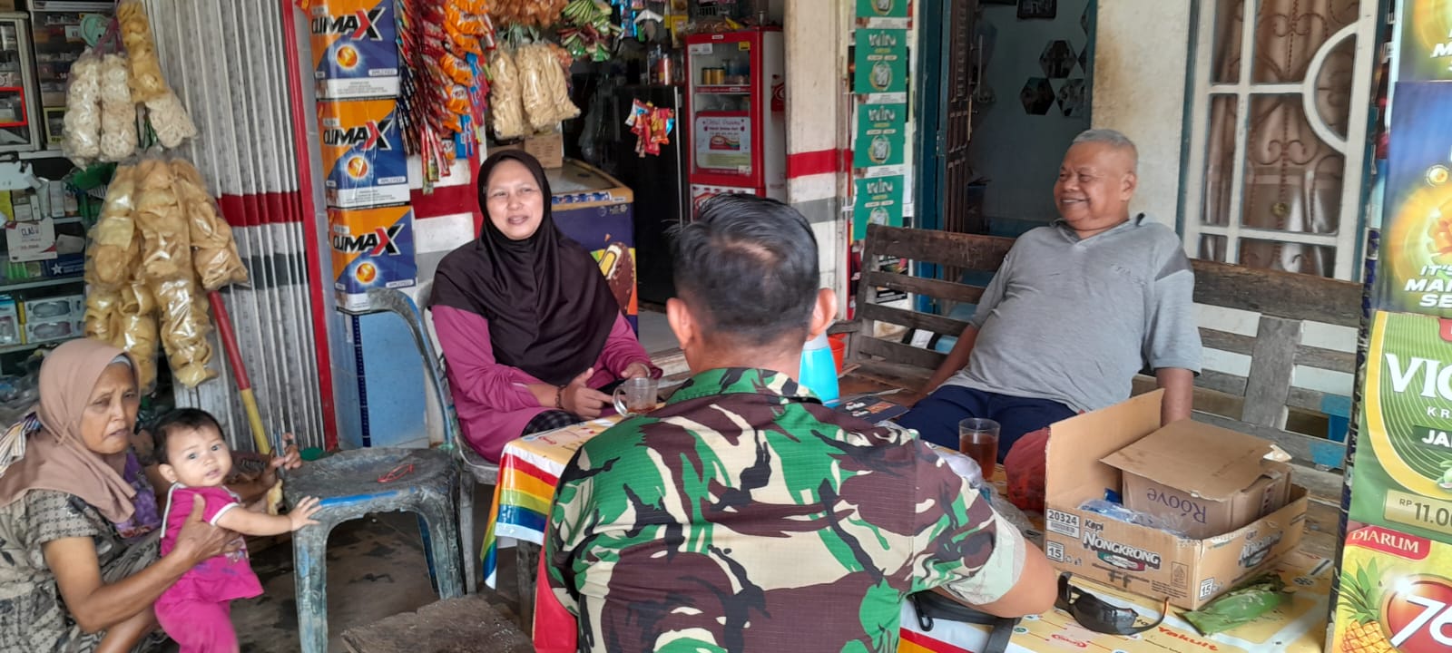 Saat itu, Babinsa sedang membeli rokok di warung tersebut. Melihat peluang yang ada, Babinsa langsung singgah dan duduk bersama dengan Bapak Zulhamjah dan istrinya untuk berbincang-bincang santai. Dalam kesempatan tersebut, Babinsa menyampaikan beberapa pesan positif terkait pentingnya menjaga keamanan dan ketertiban lingkungan, serta mengingatkan warga untuk selalu menjaga kerukunan antar tetangga.