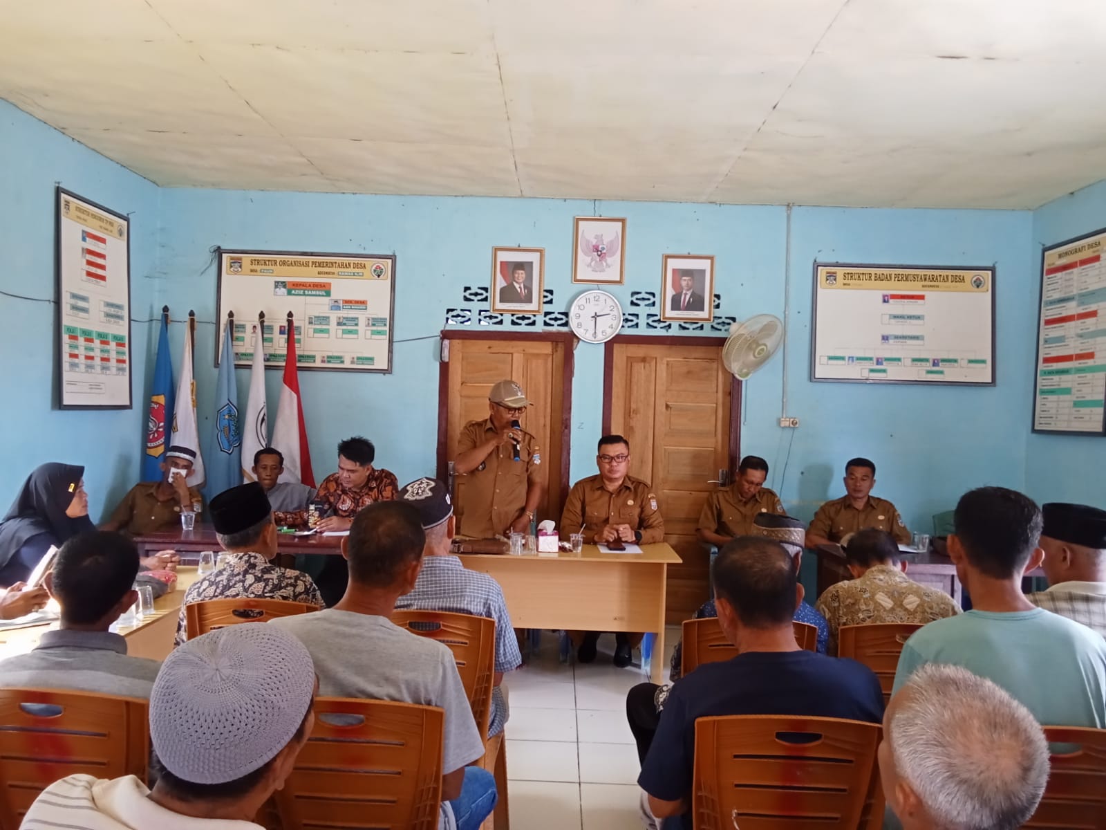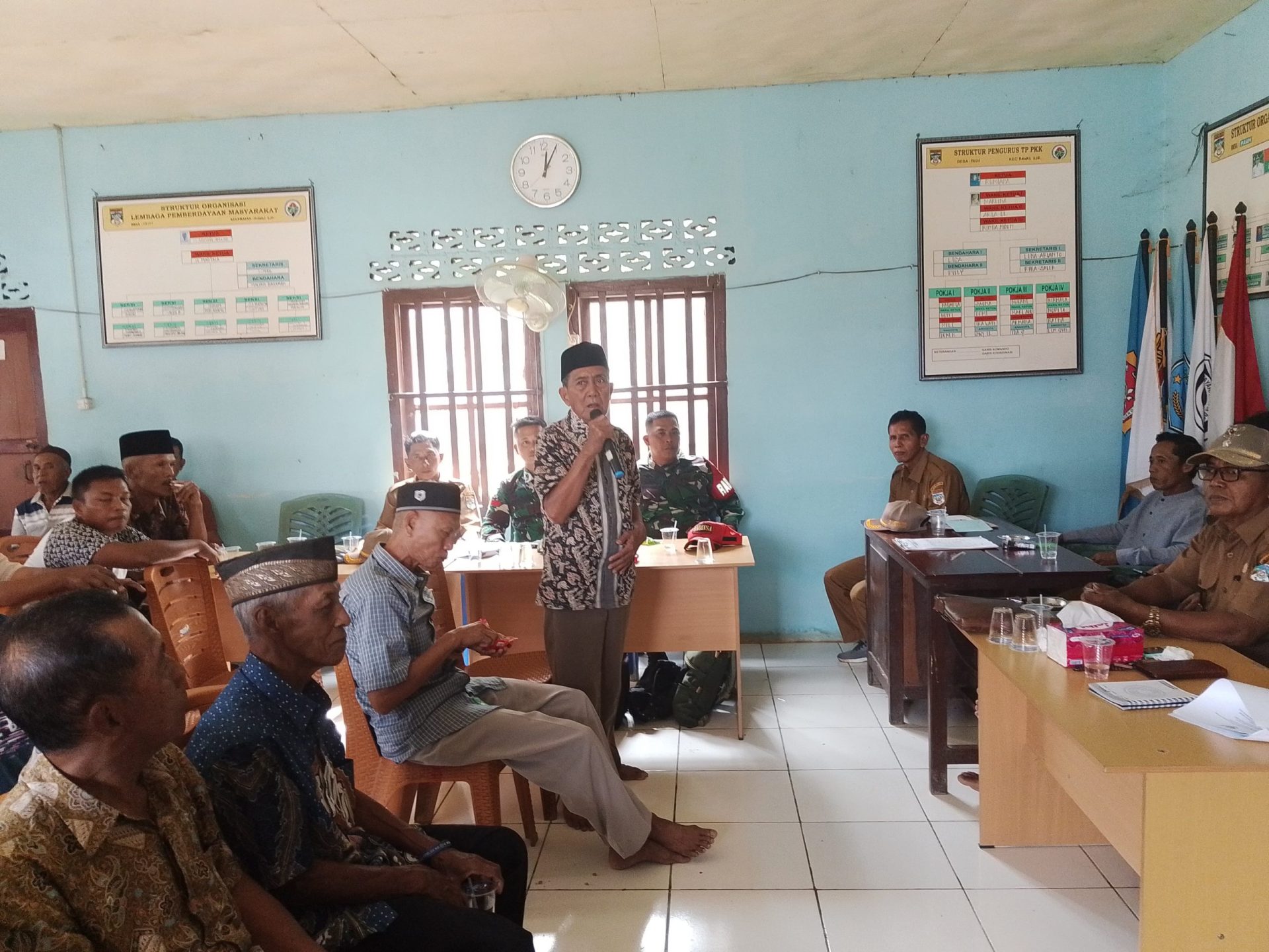 Babinsa Koramil 406-02/Rawas Ilir, Praka Jeffy Ardiyan Saputra, menghadiri pertemuan desa yang membahas peraturan keamanan di Desa Pauh, Kecamatan Rawas Ilir, Kabupaten Musi Rawas Utara. Pertemuan ini berlangsung di kantor desa dan dihadiri oleh perangkat desa serta warga setempat.