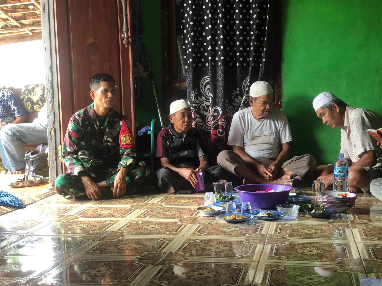 Bintara Pembina Desa (Babinsa) Koramil 406-03/Rupit, Koptu Hadi, menghadiri kegiatan Ruahan yang digelar di rumah salah satu warga binaannya di Desa Karang Waru, Kecamatan Rupit, Kabupaten Musi Rawas Utara (Muratara),