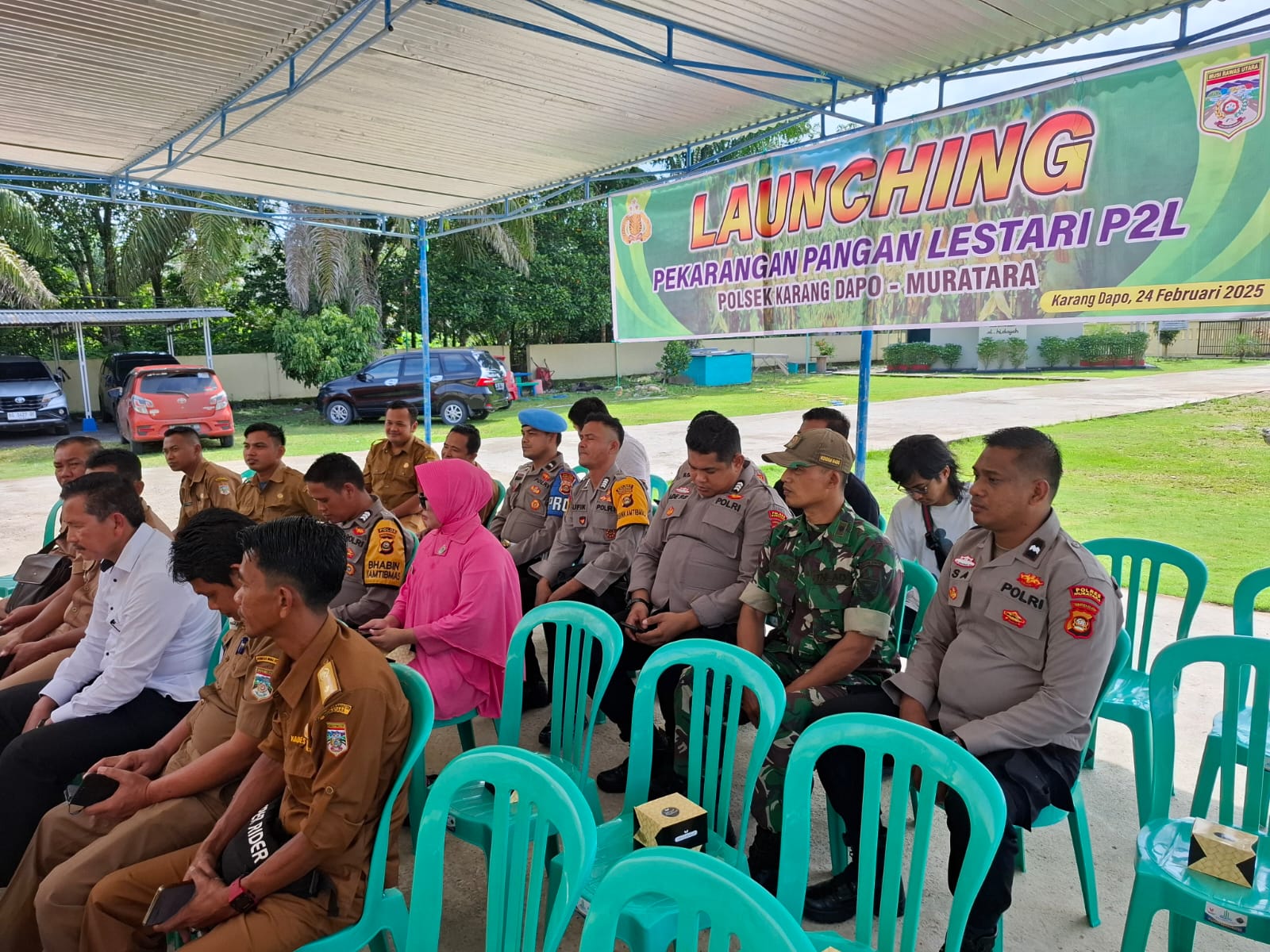 Babinsa Koramil 406-02/Rawas Ilir, Peltu M. Imron, menghadiri kegiatan launching Pekarangan Pangan Lestari (P2L) yang berlangsung di Kantor Polsek Karang Dapo, Kabupaten Musi Rawas Utara.