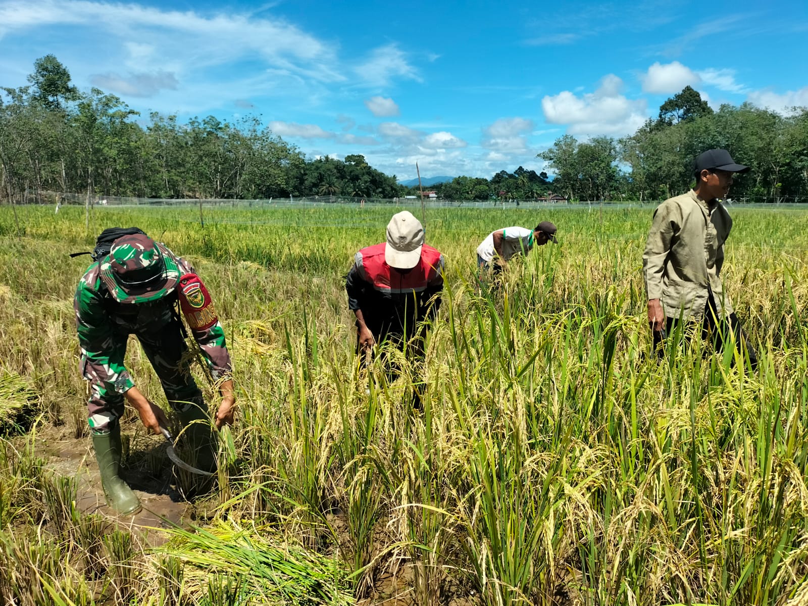 Bintara Pembina Desa (Babinsa) Koramil 406-08/Lubuklinggau, Serda Haeron, melaksanakan kegiatan komunikasi sosial (Komsos) dan pendampingan kepada warga binaan dalam rangka panen padi di Kelurahan Tabah Baru, Kecamatan Lubuklinggau Utara I, Kota Lubuklinggau.