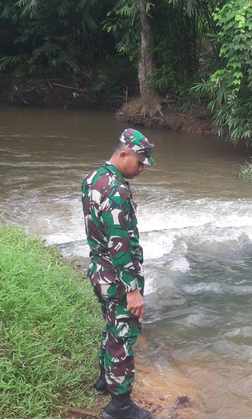 Babinsa Koramil 406-06/Tugumulyo Lakukan Pengecekan Aliran Sungai di Wilayah Rawan Banjir