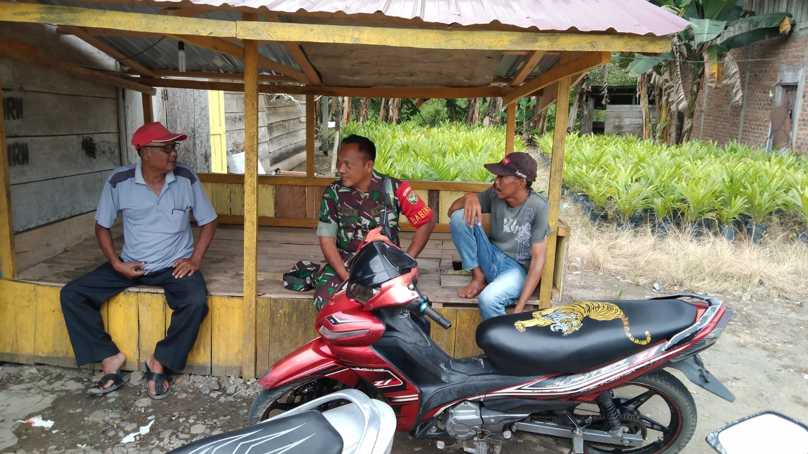 Bintara Pembina Desa (Babinsa) Koramil 406-01/Rawas Ulu, Serka Andi Gustar, melaksanakan kegiatan komunikasi sosial (komsos) dengan warga Desa Lubuk Kemang, Kecamatan Rawas Ulu, Kabupaten Musi Rawas Utara.