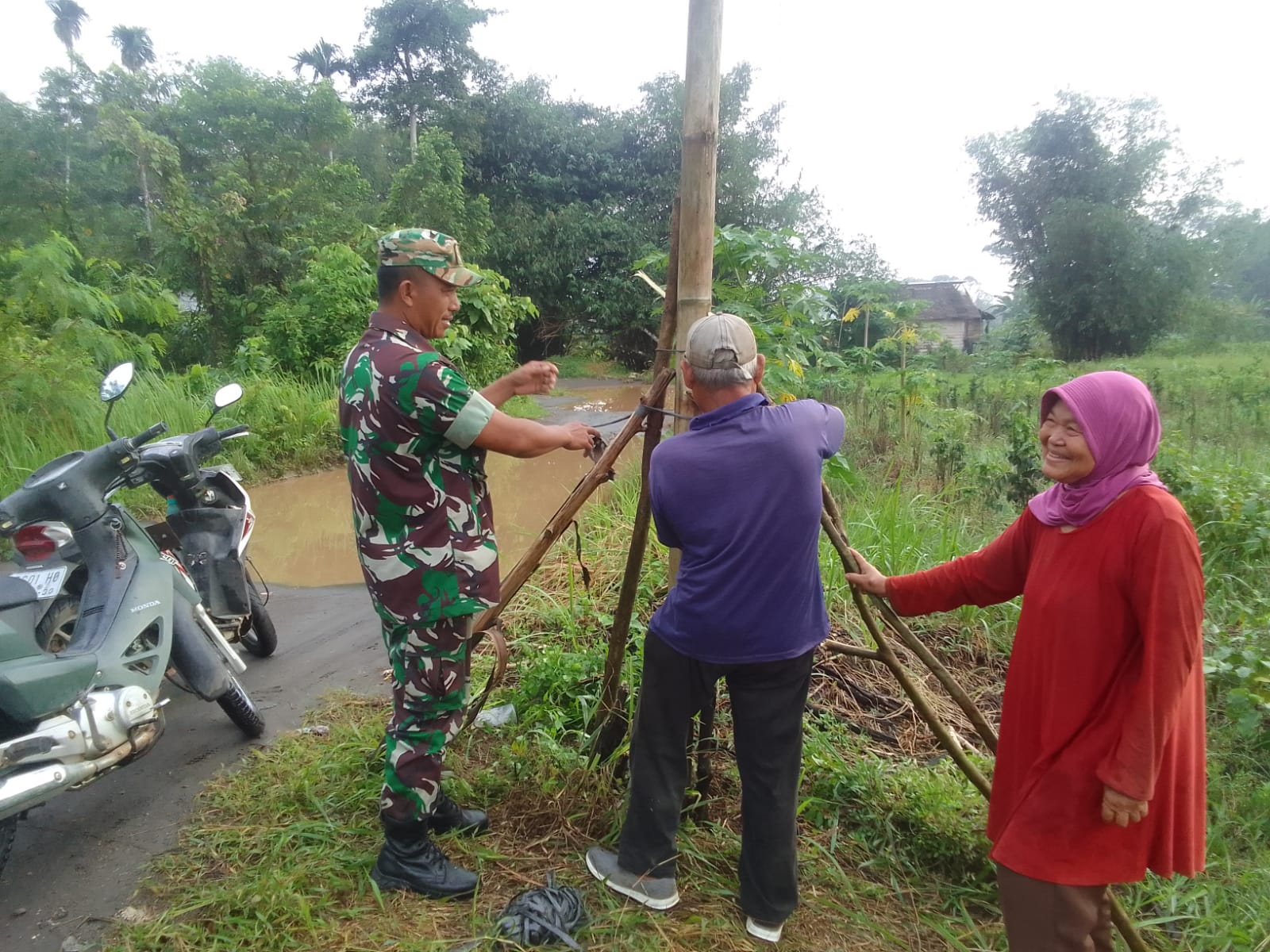 “Kami bersama warga berinisiatif membenahi tiang-tiang listrik dari bambu agar lebih kokoh dan tidak membahayakan. Ini bentuk kepedulian kami terhadap keselamatan lingkungan,” ujar Sertu Rohmadi.