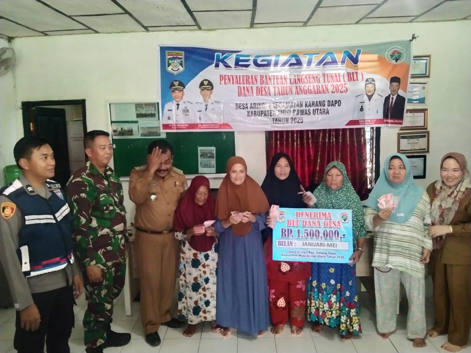 Babinsa Koramil 406-02/Rawas Ilir, Serda Joni Ismed, menghadiri kegiatan penyaluran Dana Bantuan Langsung Tunai (BLT), peninjauan Titik 0% pembangunan, serta peluncuran program ketahanan pangan (budidaya ikan) yang diselenggarakan di Desa Aringin, Kecamatan Karang Dapo, Kabupaten Musi Rawas Utara (Muratara).