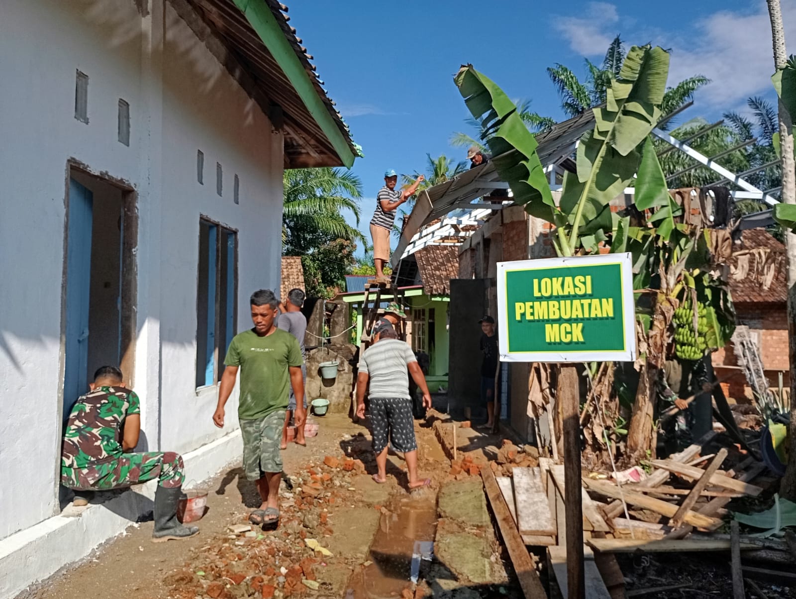 Pembangunan MCK oleh Satgas TMMD ke-125 Kodim 0406/Lubuklinggau di Desa Kota Baru SP 7 Memasuki Tahap Pemasangan Atap