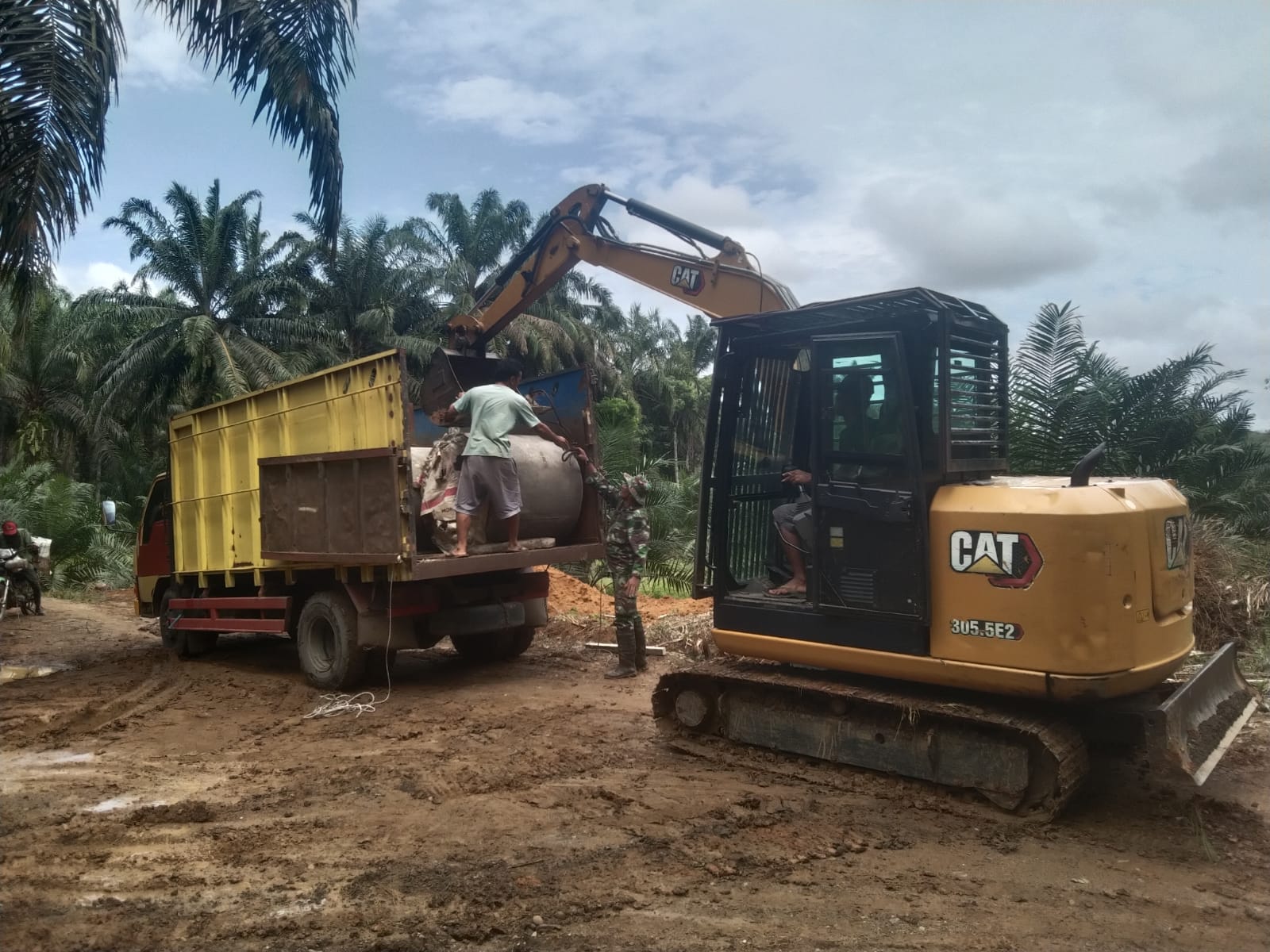 Batuud Koramil 406-05/Muara Kelingi, Pelda Leo Safitri, selaku personel Satgas TMMD ke-125, meninjau langsung proses penurunan gorong-gorong sebagai bagian dari pembangunan jalan penghubung antar dusun di desa tersebut.