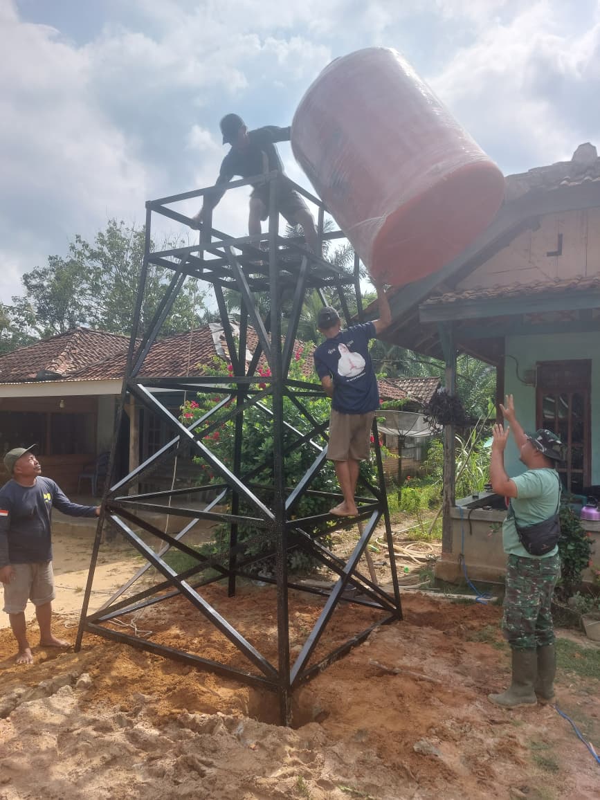 Lensa Garuda-Musi Rawas, 15 Agustus 2025, Dalam rangka mewujudkan kemanunggalan TNI dan rakyat serta mendukung program TNI Manunggal Membangun Desa (TMMD) ke-125, personel Satgas TMMD Kodim 0406/Lubuklinggau bersama masyarakat melaksanakan kegiatan gotong royong pemasangan tower air di Desa Kota Baru SP 7, Kecamatan BTS Ulu, Kabupaten Musi Rawas.