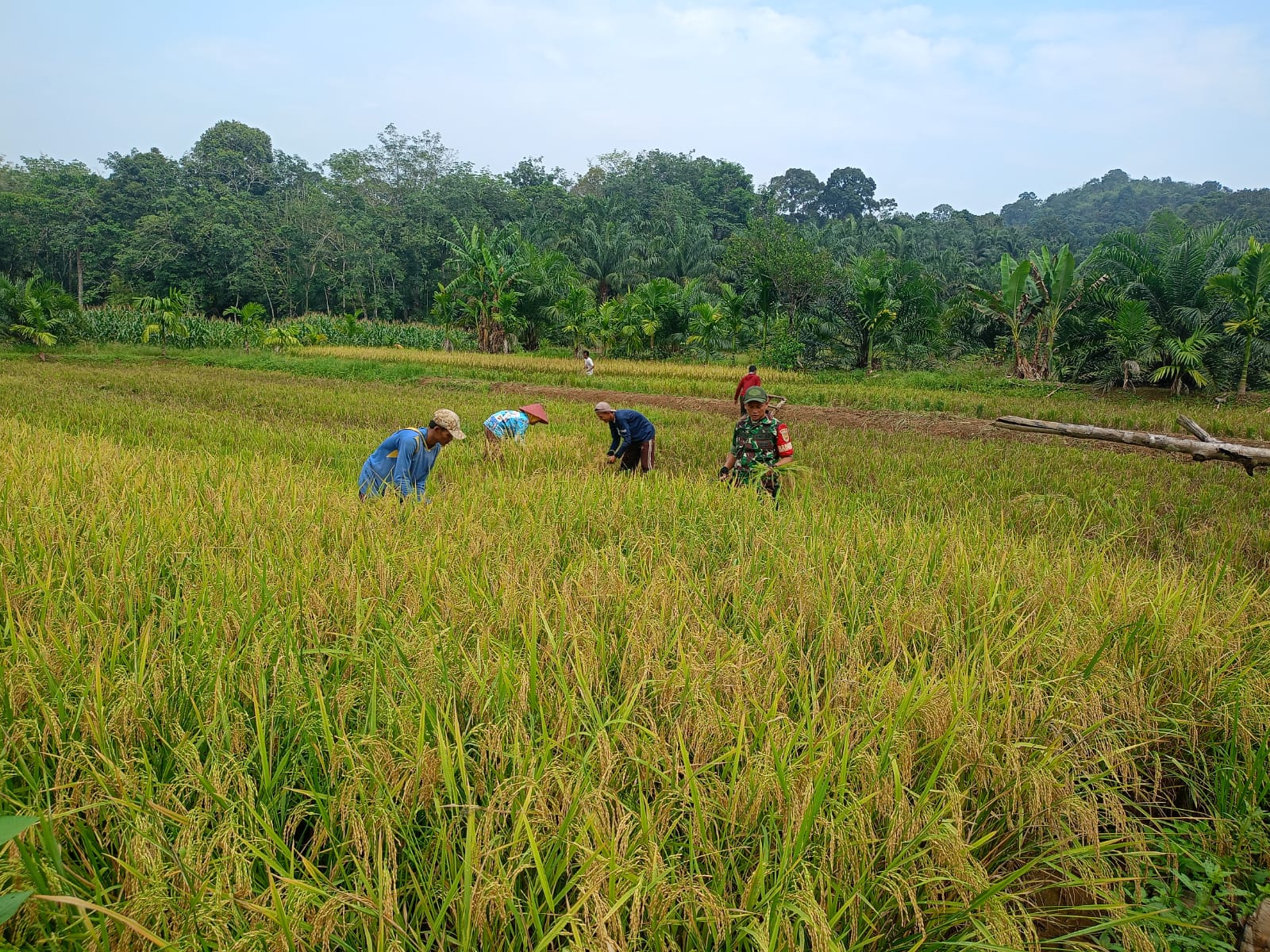 Sertu Ade Nasution, Babinsa Koramil 406-03/Rupit, Kodim 0406/Lubuklinggau, melaksanakan pendampingan kegiatan panen padi bersama para petani di Desa Bukit Ulu, Kecamatan Karang Jaya, Kabupaten Musi Rawas Utara (Muratara).