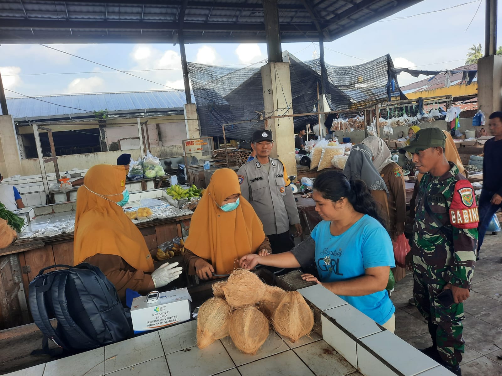 Dalam kesempatan tersebut, Babinsa turut membantu tenaga kesehatan dalam memberikan imbauan kepada para pedagang dan pengunjung pasar agar berpartisipasi dalam pemeriksaan kesehatan, serta tetap menjaga pola hidup bersih dan sehat.