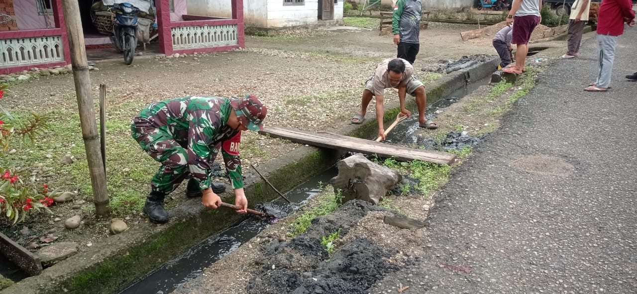 Babinsa Koramil 406-03/Rupit, Serka Yuda Satria, melaksanakan kegiatan gotong royong bersama warga binaan dengan melakukan pembersihan selokan di Kelurahan Rupit, Kecamatan Rupit, Kabupaten Musi Rawas Utara (Muratara),