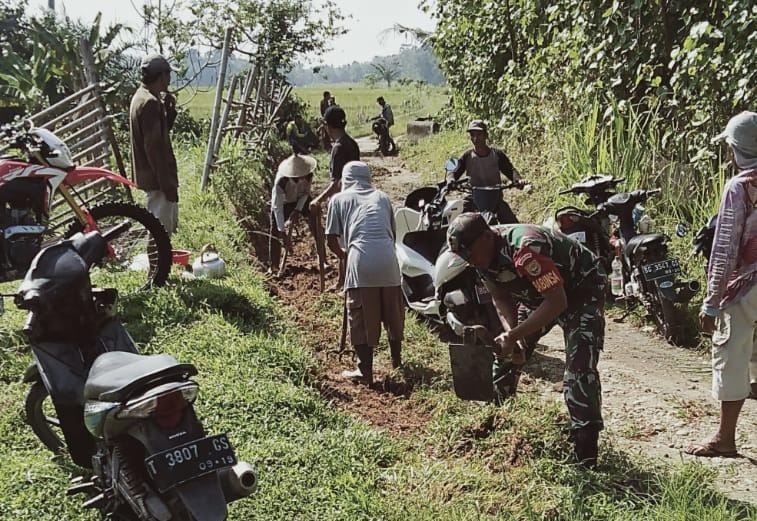 Babinsa Koramil 406-06/Tugumulyo Kodim 0406/Lubuklinggau Serka Sumanto bersama warga masyarakat melaksanakan kegiatan kerja bakti sosial membersihkan jalan dan parit Kelurahan Mangunharjo kecamatan Tugumulyo Kabupaten Musi Rawas, Jum’at (24/06/ 2022).