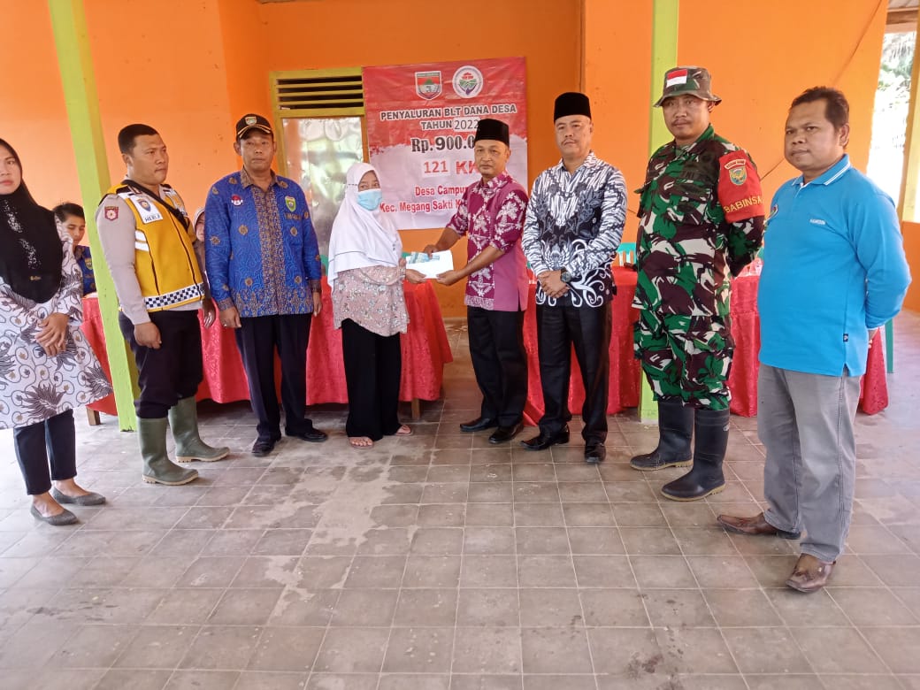 Babinsa Koramil 406-04/Lakitan Serda M Hidayat melaksanakan pendampingan penyaluran Bantuan Langsung Tunai Dana Desa (BLT DD) bertempat di kantor Desa Campur sari SP 4 Kec.Megang sakti Kab.musi rawas dengan menerapkan standar protokol kesehatan kepada 121 kk,Jumat (24/06/2022).
