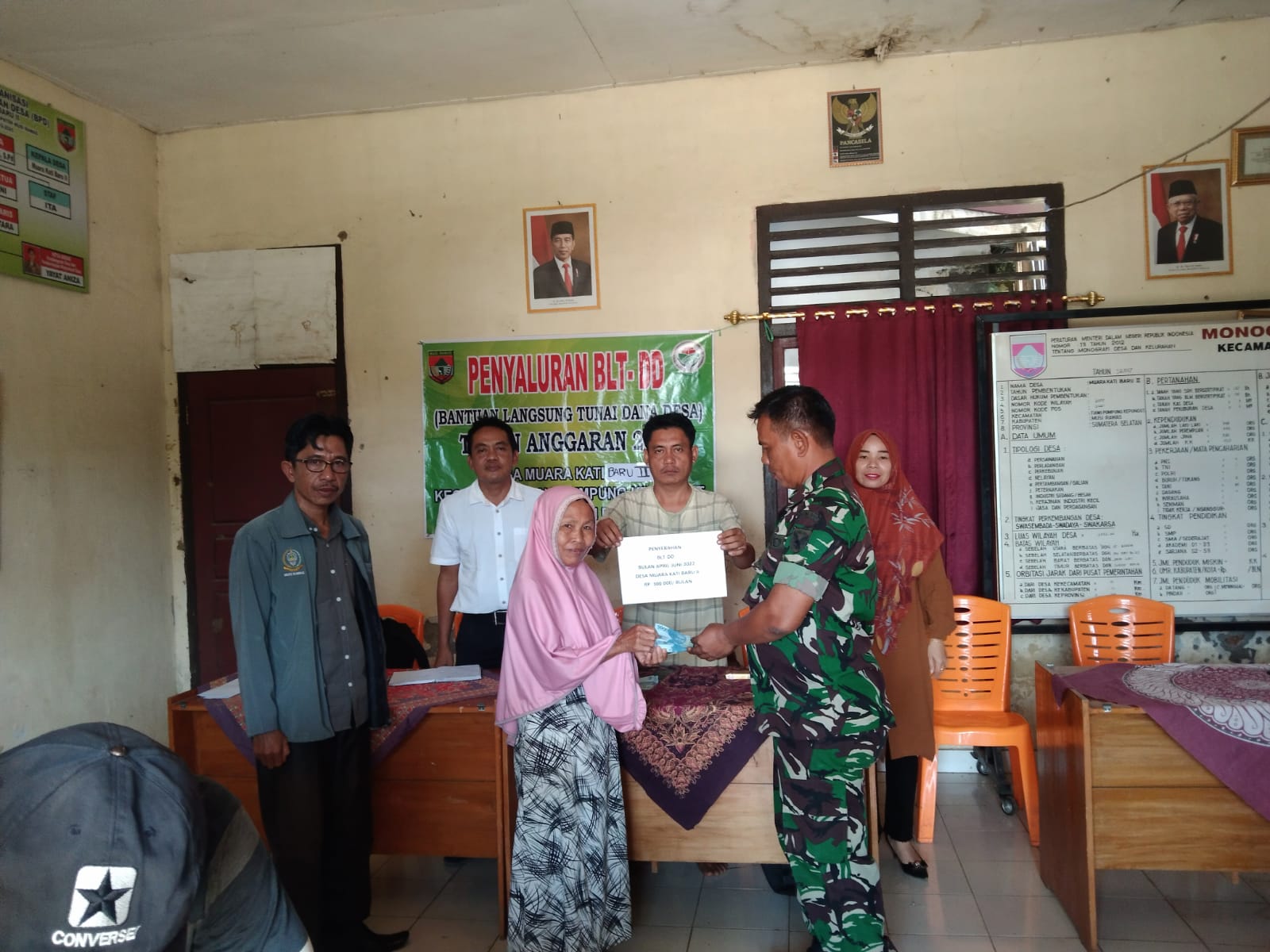 Babinsa Desa Makati Baru 2 Serka Junaidi Monitoring Pembagian BLT DD Bulan juni Sebesar 300 ribu per KPM Bertempat Kantor Desa Makati Baru 2 Kecamatan Muara Kati Baru 2 (TPK) Kabupaten Musi Rawas,Minggu (26/06/2022).