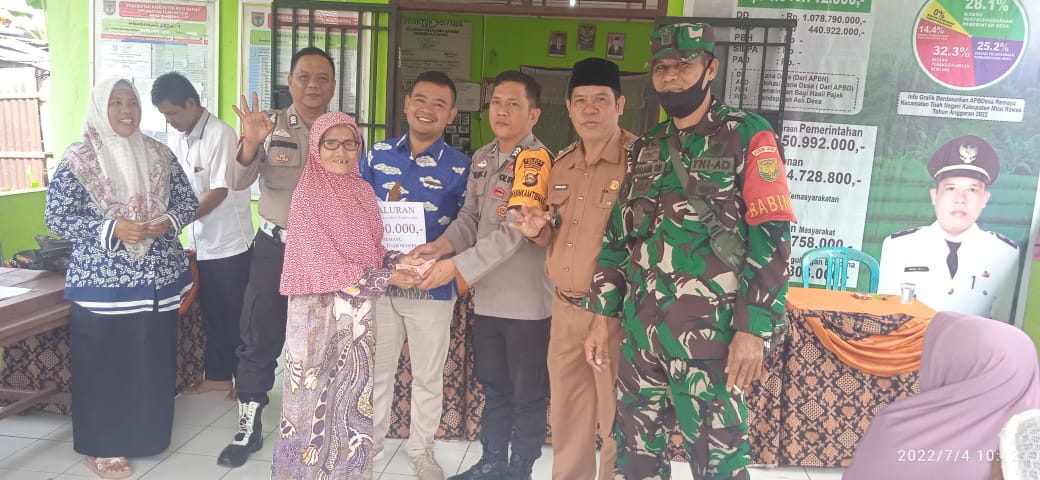 Babinsa Koramil 406-05/Muara Kelingi Jajaran Kodim 0406/LLG Serka Argani melaksanakan Pendampingan Penyerahan Bantuan Langsung Tunai Dana Desa (BLT-DD) Tahun 2022 kepada 120 Keluarga penerima manfaat. Bertempat di Desa Remayu Kecamatan Tuah Negeri Kabupaten Musi Rawas, Selasa (05/07/2022).