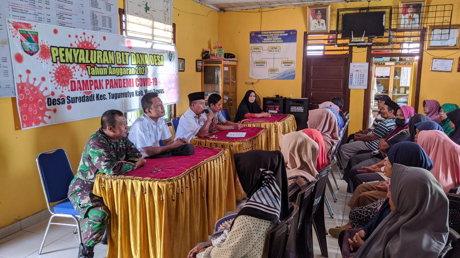 Lensa Garuda- Musi Rawas Dalam membantu pemerintah desa meningkatkan kesejahteraan masyarakat Babinsa Koramil 406-06/Tugumulyo Serma Ridwan melaksanakan Pendampingan penyaluran BLT DD Tahun 2022 Triwulan kedua di aula Kantor Desa Surodadi Kecamatan Tugumulyo, Kabupaten Musi Rawas, Rabu (06/07/2022).