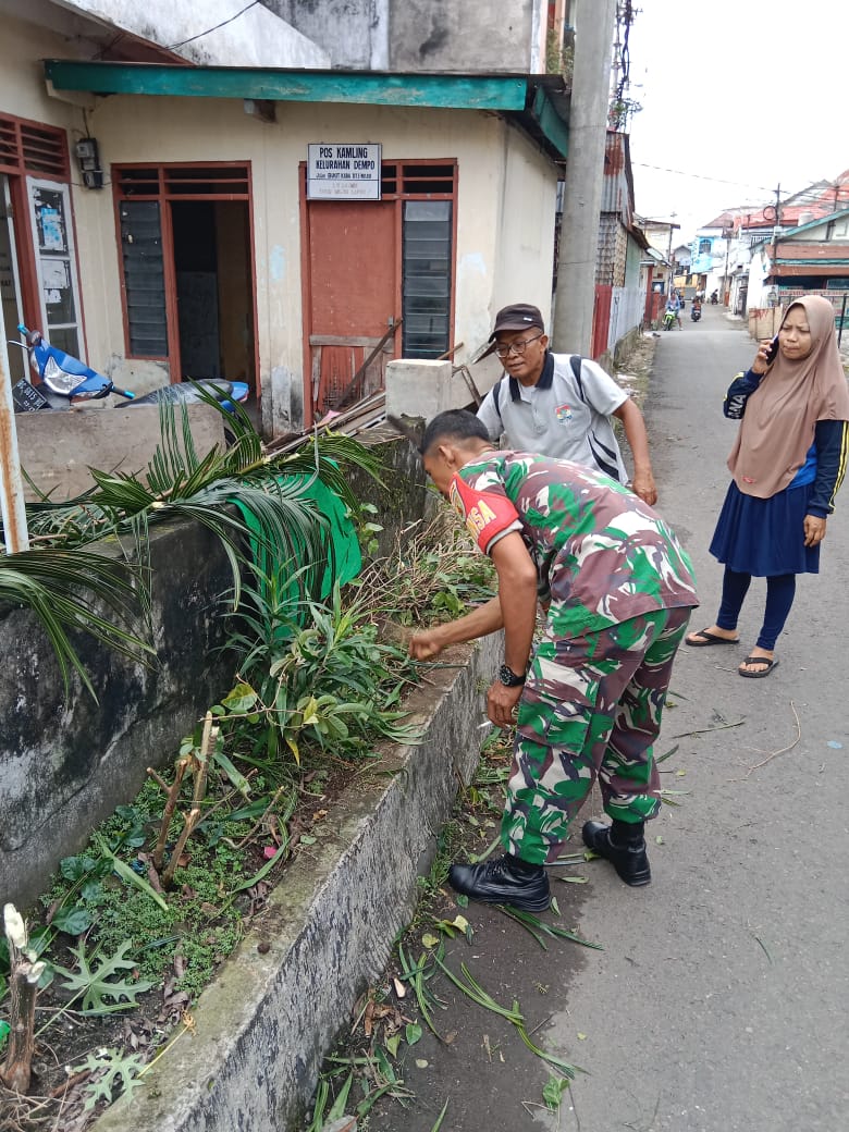 Babinsa Kelurahan Dempo Koramil 406-08/Kota Lubuklinggau Kodim 0406/Lubuklinggau Sertu Sopian, melaksanakan gotong royong bersama Perangkat Kelurahan dan para warga, Minggu (30/07/2022).