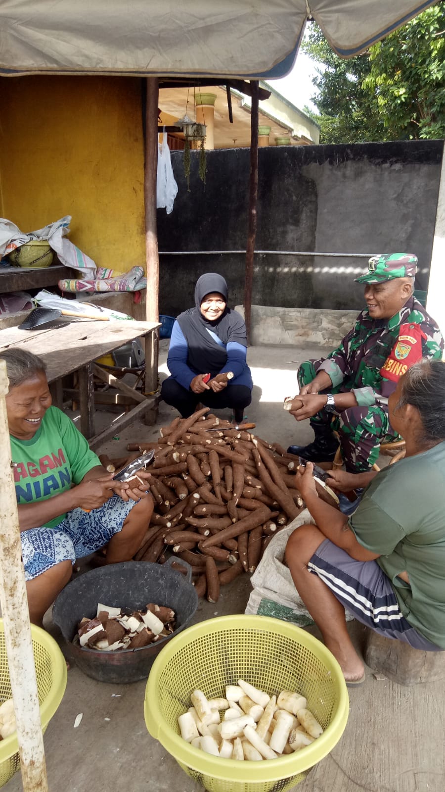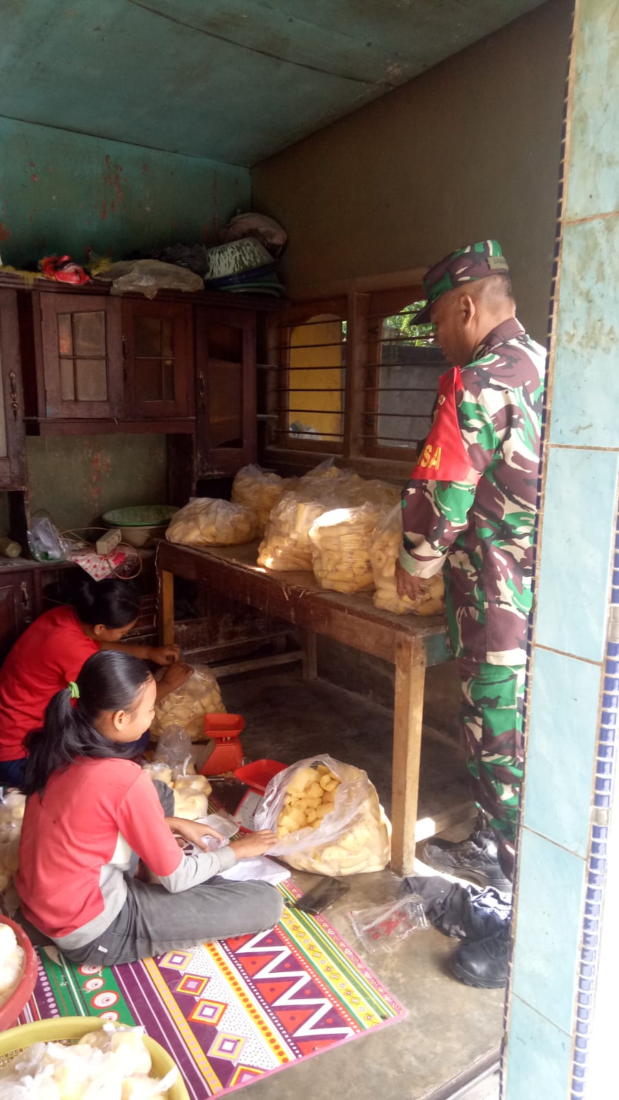 Babinsa Sertu Sarbani anggota Koramil 406-03/Muara Rupit melakukan kegiatan anjangsana dan bantu kelompok pengrajin/Keripik singkong didesa Embacang Baru Ilir Kelurahan Karang Jaya kecamatan Rupit Kabupaten Musi Rawas Utara , Kamis ( 04/08/2022).