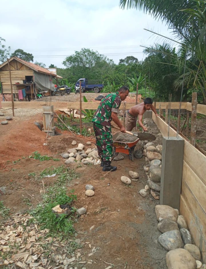 Babinsa Koramil 406-03/Muara Rupit Kodim 0406/Lubuklinggau Sertu Suprapto terjun langsung di wilayah binaan guna menjalin keakraban dan kekompakan bersama warga binaan, membantu pembuatan pondasi rumah milik Keluarga Bapak Yasin, warga Desa Karang Anyar Kecamatan Rupit Kabupaten Musi Rawas Utara, Sabtu (06/08/2022).